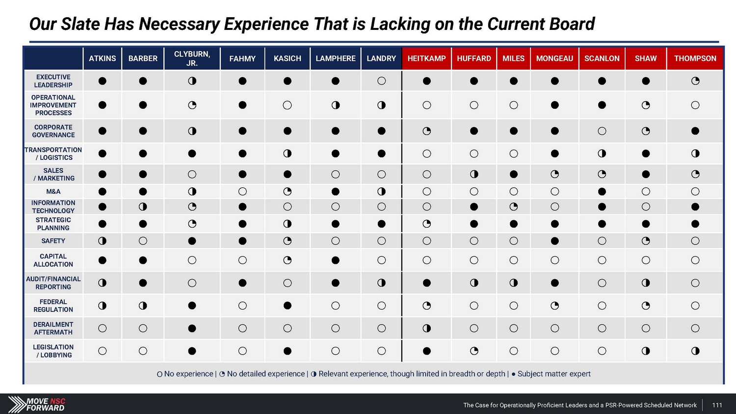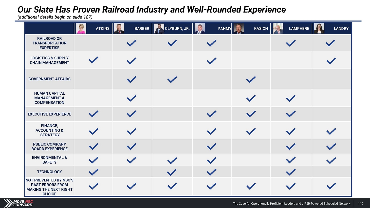 ATKINS BARBER CLYBURN, JR. FAHM Y KASICH LAMPHERE LANDRY RAILROAD OR T RANSPORT ATI ON EXPERTISE LOGISTICS & SUPPLY CHAIN MANAGEMENT GOVERNMENT AFFAIRS HUMAN CAPITAL MANAGEMENT & COMPENSATION EXECUTIVE EXPERIENCE FINANCE, ACCOUNTING & STRATEGY PUBLIC COMPANY BOARD EXPERIENCE ENVIRONMENTAL & SAFETY TECHNOLOGY NOT PREVENTED BY NSC’S PAST ERRORS FROM MAKING THE NEXT RIGHT CHOICE Our Slate Has Proven Railroad Industry and Well - Rounded Experience (additional details begin on slide 187) The Case for Operationally Proficient Leaders and a PSR - Powered Scheduled Network 110