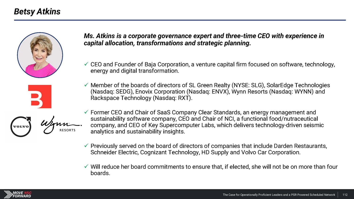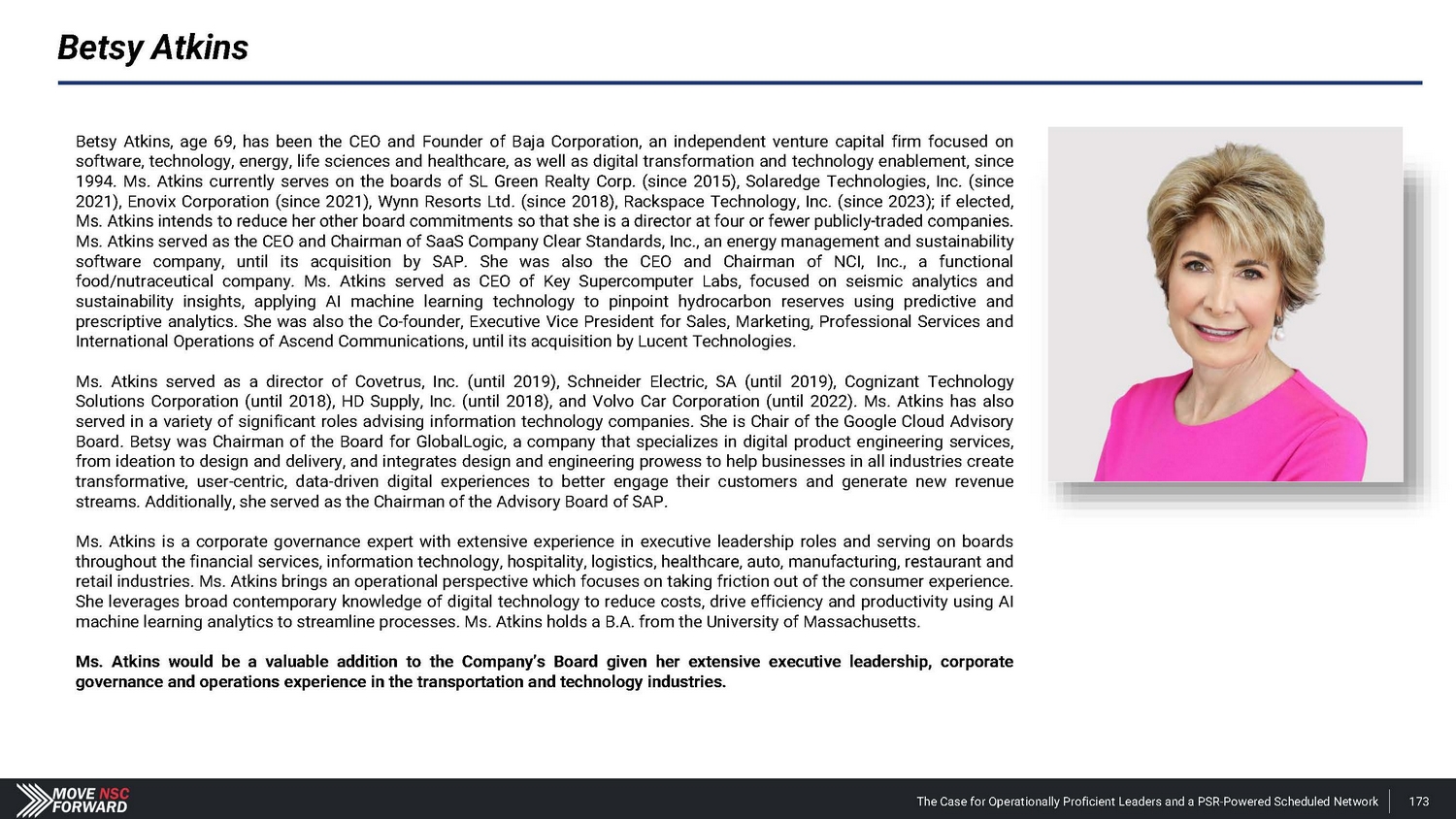 Betsy Atkins Betsy Atkins, age 69 , has been the CEO and Founder of Baja Corporation, an independent venture capital firm focused on software, technology, energy, life sciences and healthcare, as well as digital transformation and technology enablement, since 1994 . Ms . Atkins currently serves on the boards of SL Green Realty Corp . (since 2015 ), Solaredge Technologies, Inc . (since 2021 ), Enovix Corporation (since 2021 ), Wynn Resorts Ltd . (since 2018 ), Rackspace Technology, Inc . (since 2023 ) ; if elected, Ms . Atkins intends to reduce her other board commitments so that she is a director at four or fewer publicly - traded companies . Ms . Atkins served as the CEO and Chairman of SaaS Company Clear Standards, Inc . , an energy management and sustainability software company, until its acquisition by SAP . She was also the CEO and Chairman of NCI, Inc . , a functional food/nutraceutical company . Ms . Atkins served as CEO of Key Supercomputer Labs, focused on seismic analytics and sustainability insights, applying AI machine learning technology to pinpoint hydrocarbon reserves using predictive and prescriptive analytics . She was also the Co - founder, Executive Vice President for Sales, Marketing, Professional Services and International Operations of Ascend Communications, until its acquisition by Lucent Technologies . Ms . Atkins served as a director of Covetrus, Inc . (until 2019 ), Schneider Electric, SA (until 2019 ), Cognizant Technology Solutions Corporation (until 2018 ), HD Supply, Inc . (until 2018 ), and Volvo Car Corporation (until 2022 ) . Ms . Atkins has also served in a variety of significant roles advising information technology companies . She is Chair of the Google Cloud Advisory Board . Betsy was Chairman of the Board for GlobalLogic, a company that specializes in digital product engineering services, from ideation to design and delivery, and integrates design and engineering prowess to help businesses in all industries create transformative, user - centric, data - driven digital experiences to better engage their customers and generate new revenue streams . Additionally, she served as the Chairman of the Advisory Board of SAP . Ms . Atkins is a corporate governance expert with extensive experience in executive leadership roles and serving on boards throughout the financial services, information technology, hospitality, logistics, healthcare, auto, manufacturing, restaurant and retail industries . Ms . Atkins brings an operational perspective which focuses on taking friction out of the consumer experience . She leverages broad contemporary knowledge of digital technology to reduce costs, drive efficiency and productivity using AI machine learning analytics to streamline processes . Ms . Atkins holds a B . A . from the University of Massachusetts . Ms . Atkins would be a valuable addition to the Company’s Board given her extensive executive leadership, corporate governance and operations experience in the transportation and technology industries . The Case for Operationally Proficient Leaders and a PSR - Powered Scheduled Network 173