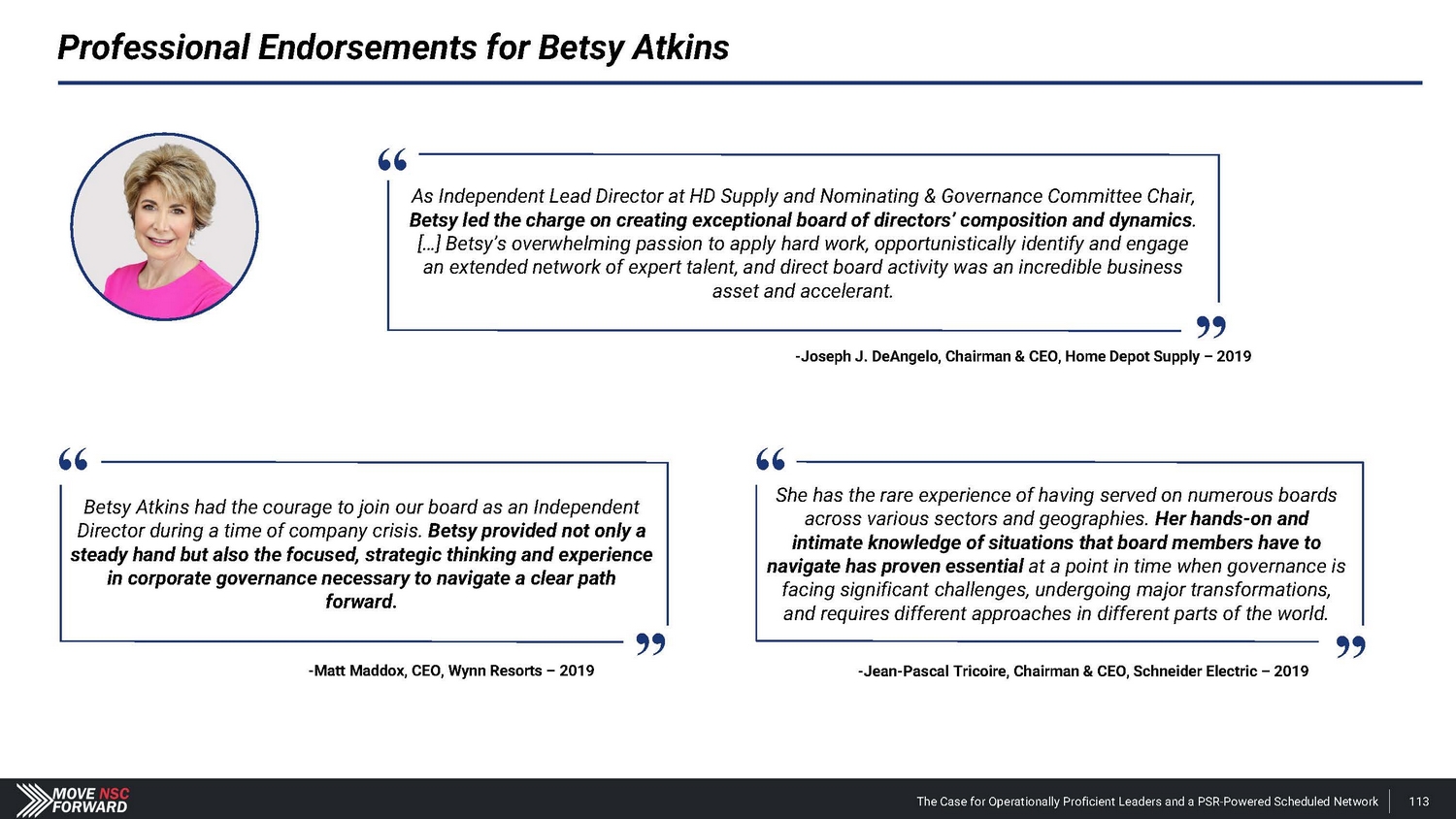 Professional Endorsements for Betsy Atkins Betsy led the charge on creating exceptional board of directors’ composition and dynamics . […] Betsy’s overwhelming passion to apply hard work, opportunistically identify and engage an extended network of expert talent, and direct board activity was an incredible business asset and accelerant. - Joseph J. DeAngelo, Chairman & CEO, Home Depot Supply – 2019 across various sectors and geographies. Her hands - on and intimate knowledge of situations that board members have to navigate has proven essential at a point in time when governance is facing significant challenges, undergoing major transformations, and requires different approaches in different parts of the world. - Jean - Pascal Tricoire, Chairman & CEO, Schneider Electric – 2019 Director during a time of company crisis. Betsy provided not only a steady hand but also the focused, strategic thinking and experience in corporate governance necessary to navigate a clear path forward. - Matt Maddox, CEO, Wynn Resorts – 2019 “ As Independent Lea d Di r ecto r at HD Suppl y and Nominating & Governance Com m ittee Chair, “ Betsy Atkins had the courage to join our board as an Independent “ She ha s t he r are exp erien ce o f h a vi n g served o n numero u s b o ards The Case for Operationally Proficient Leaders and a PSR - Powered Scheduled Network 113