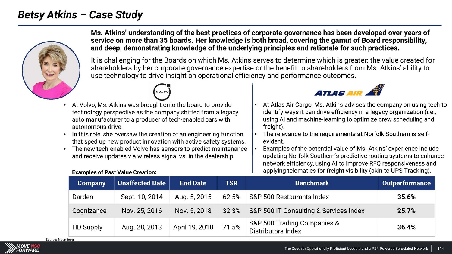 Betsy Atkins – Case Study Ms. Atkins’ understanding of the best practices of corporate governance has been developed over years of service on more than 35 boards. Her knowledge is both broad, covering the gamut of Board responsibility, and deep, demonstrating knowledge of the underlying principles and rationale for such practices. It is challenging for the Boards on which Ms. Atkins serves to determine which is greater: the value created for shareholders by her corporate governance expertise or the benefit to shareholders from Ms. Atkins’ ability to use technology to drive insight on operational efficiency and performance outcomes. • At Volvo, Ms. Atkins was brought onto the board to provide technology perspective as the company shifted from a legacy auto manufacturer to a producer of tech - enabled cars with autonomous drive. • In this role, she oversaw the creation of an engineering function that sped up new product innovation with active safety systems. • The new tech - enabled Volvo has sensors to predict maintenance and receive updates via wireless signal vs. in the dealership. • At Atlas Air Cargo, Ms. Atkins advises the company on using tech to identify ways it can drive efficiency in a legacy organization (i.e., using AI and machine - learning to optimize crew scheduling and freight). • The relevance to the requirements at Norfolk Southern is self - evident. • Examples of the potential value of Ms. Atkins’ experience include updating Norfolk Southern’s predictive routing systems to enhance network efficiency, using AI to improve RFQ responsiveness and applying telematics for freight visibility (akin to UPS Tracking). Examples of Past Value Creation: The Case for Operationally Proficient Leaders and a PSR - Powered Scheduled Network 114 Company Unaffected Date End Date TSR Benchmark Outperformance Darden Sept. 10, 2014 Aug. 5, 2015 62.5% S&P 500 Restaurants Index 35.6% Cognizance Nov. 25, 2016 Nov. 5, 2018 32.3% S&P 500 IT Consulting & Services Index 25.7% HD Supply Aug. 28, 2013 April 19, 2018 71.5% S&P 500 Trading Companies & Distributors Index 36.4% Source: Bloomberg.