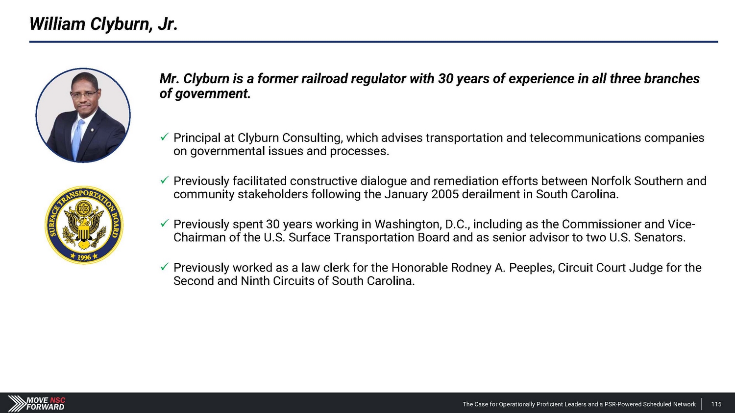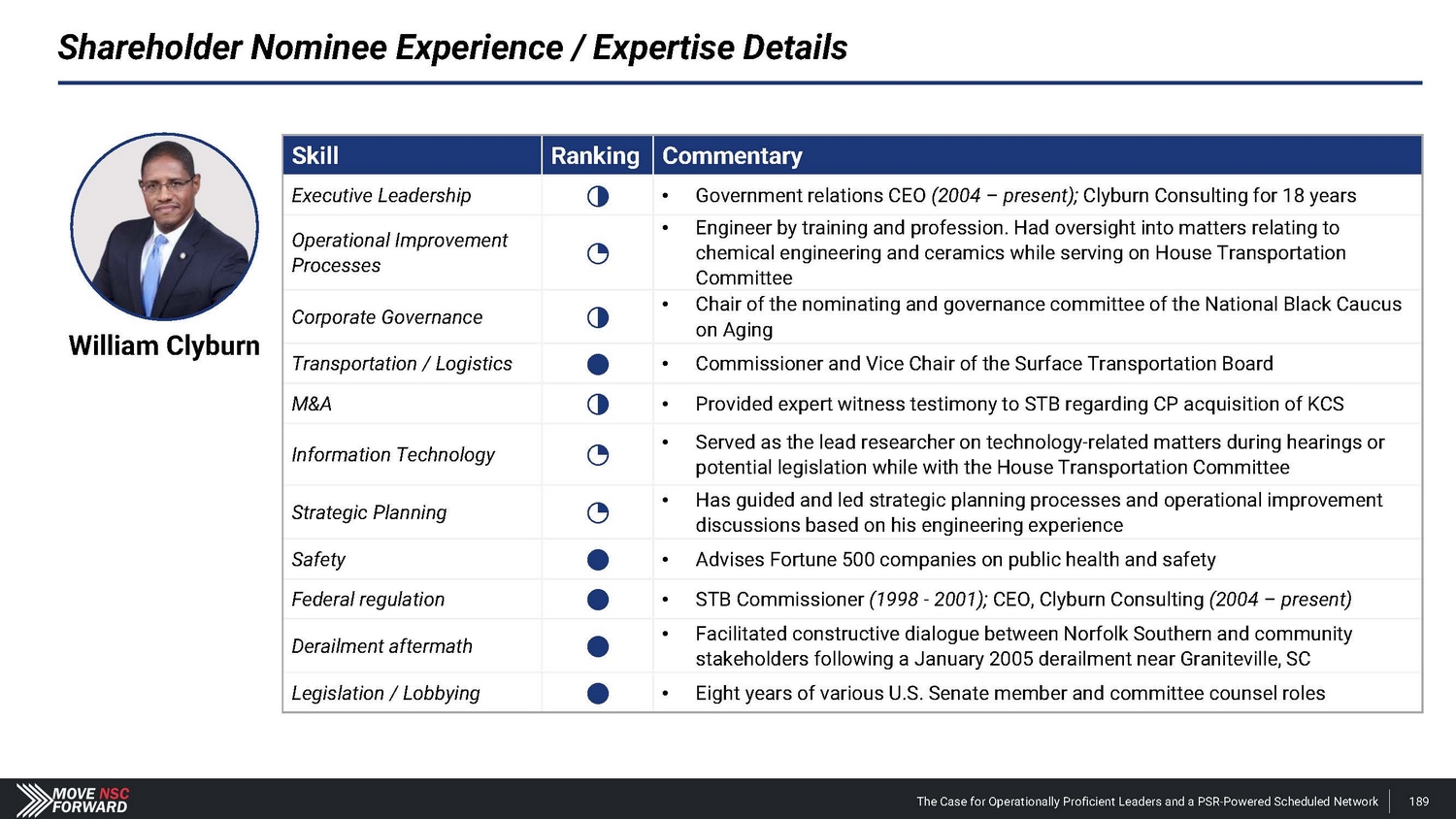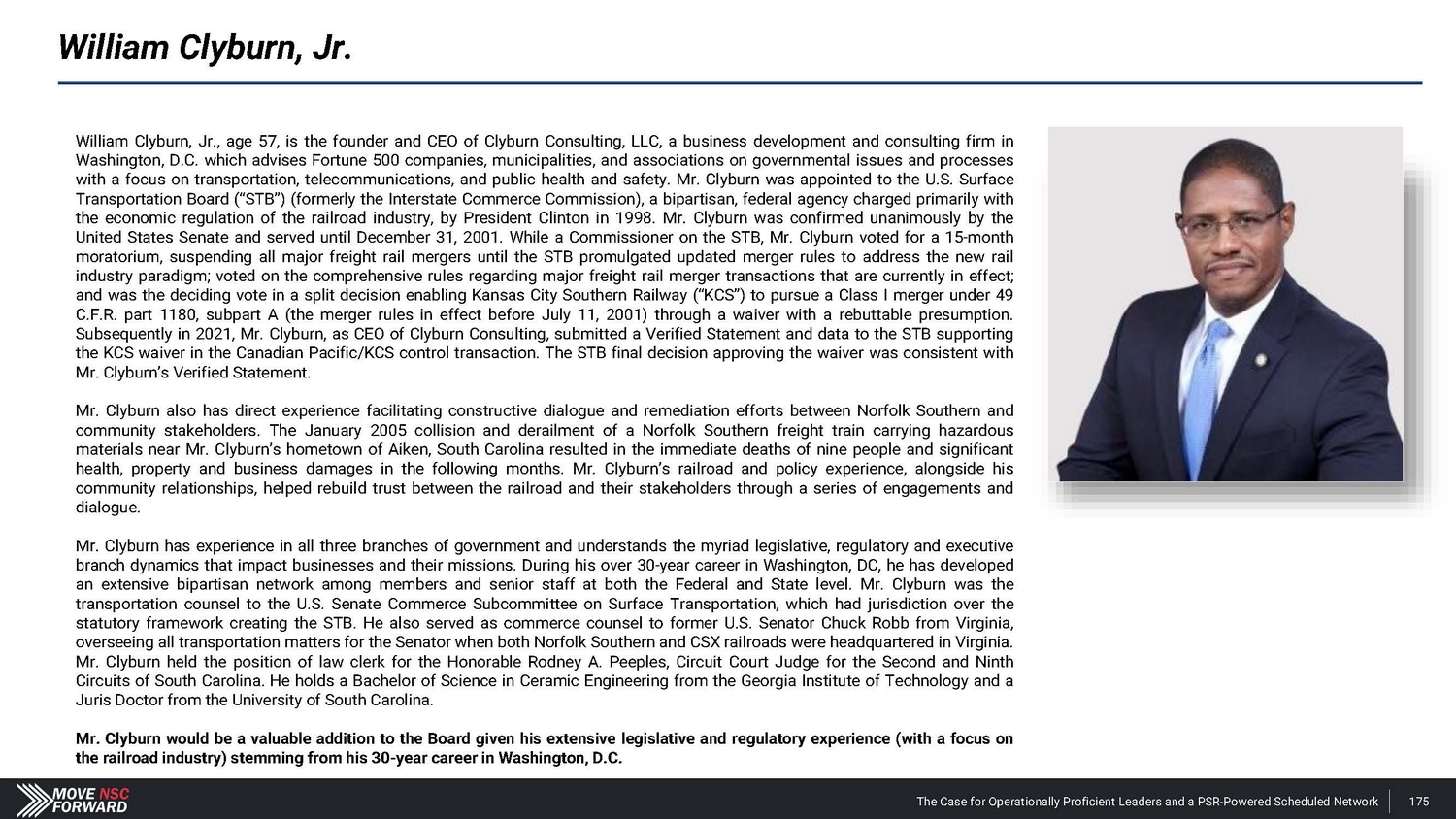 William Clyburn, Jr. William Clyburn, Jr . , age 57 , is the founder and CEO of Clyburn Consulting, LLC, a business development and consulting firm in Washington, D . C . which advises Fortune 500 companies, municipalities, and associations on governmental issues and processes with a focus on transportation, telecommunications, and public health and safety . Mr . Clyburn was appointed to the U . S . Surface Transportation Board (“STB”) (formerly the Interstate Commerce Commission), a bipartisan, federal agency charged primarily with the economic regulation of the railroad industry, by President Clinton in 1998 . Mr . Clyburn was confirmed unanimously by the United States Senate and served until December 31 , 2001 . While a Commissioner on the STB, Mr . Clyburn voted for a 15 - month moratorium, suspending all major freight rail mergers until the STB promulgated updated merger rules to address the new rail industry paradigm ; voted on the comprehensive rules regarding major freight rail merger transactions that are currently in effect ; and was the deciding vote in a split decision enabling Kansas City Southern Railway (“KCS”) to pursue a Class I merger under 49 C . F . R . part 1180 , subpart A (the merger rules in effect before July 11 , 2001 ) through a waiver with a rebuttable presumption . Subsequently in 2021 , Mr . Clyburn, as CEO of Clyburn Consulting, submitted a Verified Statement and data to the STB supporting the KCS waiver in the Canadian Pacific/KCS control transaction . The STB final decision approving the waiver was consistent with Mr . Clyburn’s Verified Statement . Mr . Clyburn also has direct experience facilitating constructive dialogue and remediation efforts between Norfolk Southern and community stakeholders . The January 2005 collision and derailment of a Norfolk Southern freight train carrying hazardous materials near Mr . Clyburn’s hometown of Aiken, South Carolina resulted in the immediate deaths of nine people and significant health, property and business damages in the following months . Mr . Clyburn’s railroad and policy experience, alongside his community relationships, helped rebuild trust between the railroad and their stakeholders through a series of engagements and dialogue . Mr . Clyburn has experience in all three branches of government and understands the myriad legislative, regulatory and executive branch dynamics that impact businesses and their missions . During his over 30 - year career in Washington, DC, he has developed an extensive bipartisan network among members and senior staff at both the Federal and State level . Mr . Clyburn was the transportation counsel to the U . S . Senate Commerce Subcommittee on Surface Transportation, which had jurisdiction over the statutory framework creating the STB . He also served as commerce counsel to former U . S . Senator Chuck Robb from Virginia, overseeing all transportation matters for the Senator when both Norfolk Southern and CSX railroads were headquartered in Virginia . Mr . Clyburn held the position of law clerk for the Honorable Rodney A . Peeples, Circuit Court Judge for the Second and Ninth Circuits of South Carolina . He holds a Bachelor of Science in Ceramic Engineering from the Georgia Institute of Technology and a Juris Doctor from the University of South Carolina . Mr . Clyburn would be a valuable addition to the Board given his extensive legislative and regulatory experience (with a focus on the railroad industry) stemming from his 30 - year career in Washington, D . C . The Case for Operationally Proficient Leaders and a PSR - Powered Scheduled Network 175