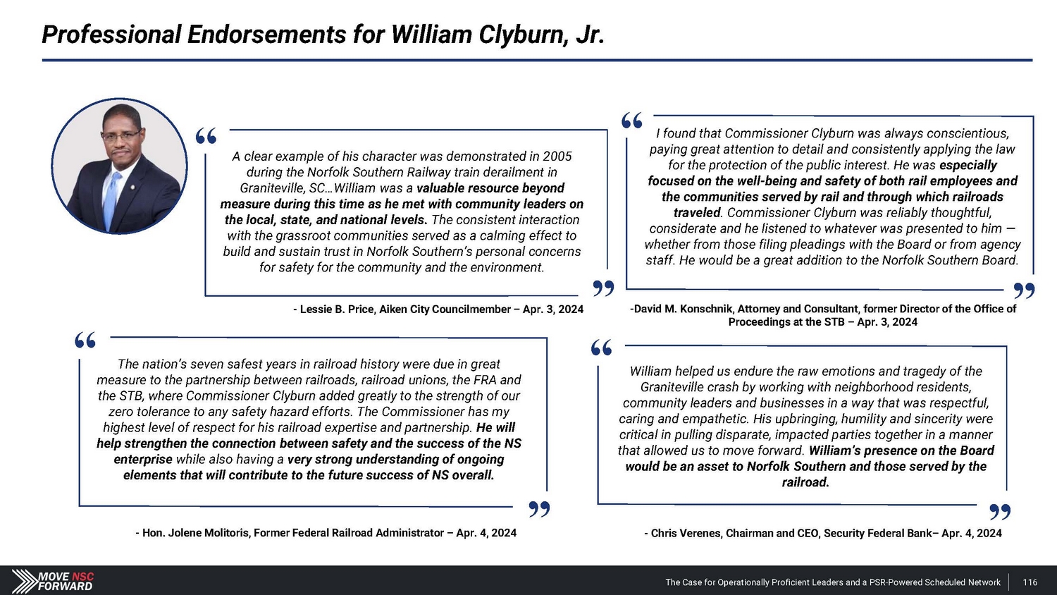Professional Endorsements for William Clyburn, Jr. I found that Commissioner Clyburn was always conscientious, paying great attention to detail and consistently applying the law for the protection of the public interest. He was especially focused on the well - being and safety of both rail employees and the communities served by rail and through which railroads traveled . Commissioner Clyburn was reliably thoughtful, considerate and he listened to whatever was presented to him — whether from those filing pleadings with the Board or from agency staff. He would be a great addition to the Norfolk Southern Board. The nation’s seven safest years in railroad history were due in great measure to the partnership between railroads, railroad unions, the FRA and the STB, where Commissioner Clyburn added greatly to the strength of our zero tolerance to any safety hazard efforts. The Commissioner has my highest level of respect for his railroad expertise and partnership. He will help strengthen the connection between safety and the success of the NS enterprise while also having a very strong understanding of ongoing elements that will contribute to the future success of NS overall. William helped us endure the raw emotions and tragedy of the Graniteville crash by working with neighborhood residents, community leaders and businesses in a way that was respectful, caring and empathetic. His upbringing, humility and sincerity were critical in pulling disparate, impacted parties together in a manner that allowed us to move forward. William’s presence on the Board would be an asset to Norfolk Southern and those served by the railroad. “ “ “ “ The Case for Operationally Proficient Leaders and a PSR - Powered Scheduled Network 116 A clear example of his character was demonstrated in 2005 during the Norfolk Southern Railway train derailment in Graniteville, SC…William was a valuable resource beyond measure during this time as he met with community leaders on the local, state, and national levels. The consistent interaction with the grassroot communities served as a calming effect to build and sustain trust in Norfolk Southern’s personal concerns for safety for the community and the environment. - Lessie B. Price, Aiken City Councilmember – Apr. 3, 2024 - David M. Konschnik, Attorney and Consultant, former Director of the Office of Proceedings at the STB – Apr. 3, 2024 - Hon. Jolene Molitoris, Former Federal Railroad Administrator – Apr. 4, 2024 - Chris Verenes, Chairman and CEO, Security Federal Bank – Apr. 4, 2024