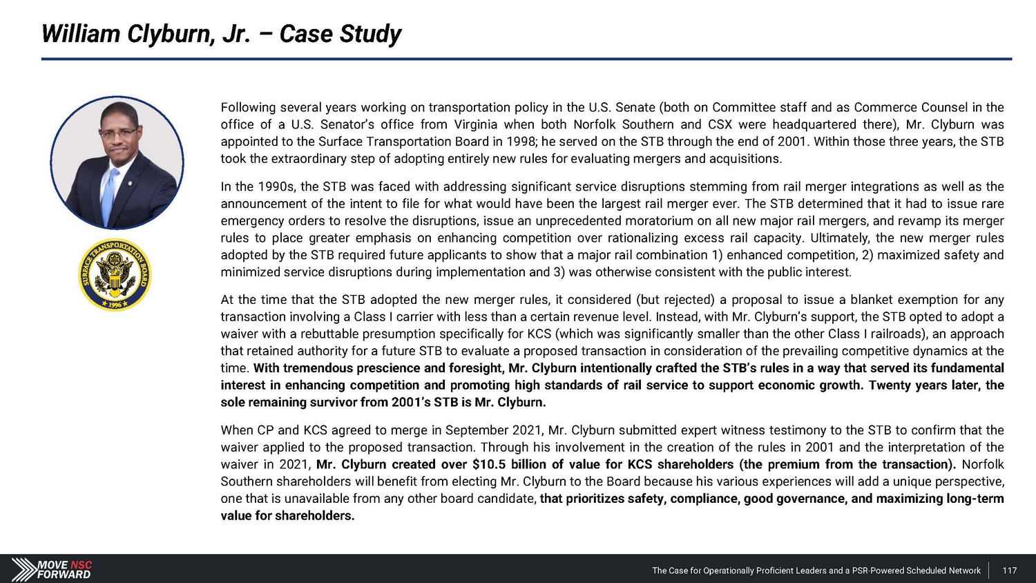 William Clyburn, Jr. – Case Study Following several years working on transportation policy in the U . S . Senate (both on Committee staff and as Commerce Counsel in the office of a U . S . Senator’s office from Virginia when both Norfolk Southern and CSX were headquartered there), Mr . Clyburn was appointed to the Surface Transportation Board in 1998 ; he served on the STB through the end of 2001 . Within those three years, the STB took the extraordinary step of adopting entirely new rules for evaluating mergers and acquisitions . In the 1990 s, the STB was faced with addressing significant service disruptions stemming from rail merger integrations as well as the announcement of the intent to file for what would have been the largest rail merger ever . The STB determined that it had to issue rare emergency orders to resolve the disruptions, issue an unprecedented moratorium on all new major rail mergers, and revamp its merger rules to place greater emphasis on enhancing competition over rationalizing excess rail capacity . Ultimately, the new merger rules adopted by the STB required future applicants to show that a major rail combination 1 ) enhanced competition, 2 ) maximized safety and minimized service disruptions during implementation and 3 ) was otherwise consistent with the public interest . At the time that the STB adopted the new merger rules, it considered (but rejected) a proposal to issue a blanket exemption for any transaction involving a Class I carrier with less than a certain revenue level . Instead, with Mr . Clyburn’s support, the STB opted to adopt a waiver with a rebuttable presumption specifically for KCS (which was significantly smaller than the other Class I railroads), an approach that retained authority for a future STB to evaluate a proposed transaction in consideration of the prevailing competitive dynamics at the time . With tremendous prescience and foresight, Mr . Clyburn intentionally crafted the STB’s rules in a way that served its fundamental interest in enhancing competition and promoting high standards of rail service to support economic growth . Twenty years later, the sole remaining survivor from 2001 ’s STB is Mr . Clyburn . When CP and KCS agreed to merge in September 2021 , Mr . Clyburn submitted expert witness testimony to the STB to confirm that the waiver applied to the proposed transaction . Through his involvement in the creation of the rules in 2001 and the interpretation of the waiver in 2021 , Mr . Clyburn created over $ 10 . 5 billion of value for KCS shareholders (the premium from the transaction) . Norfolk Southern shareholders will benefit from electing Mr . Clyburn to the Board because his various experiences will add a unique perspective, one that is unavailable from any other board candidate, that prioritizes safety, compliance, good governance, and maximizing long - term value for shareholders . The Case for Operationally Proficient Leaders and a PSR - Powered Scheduled Network 117