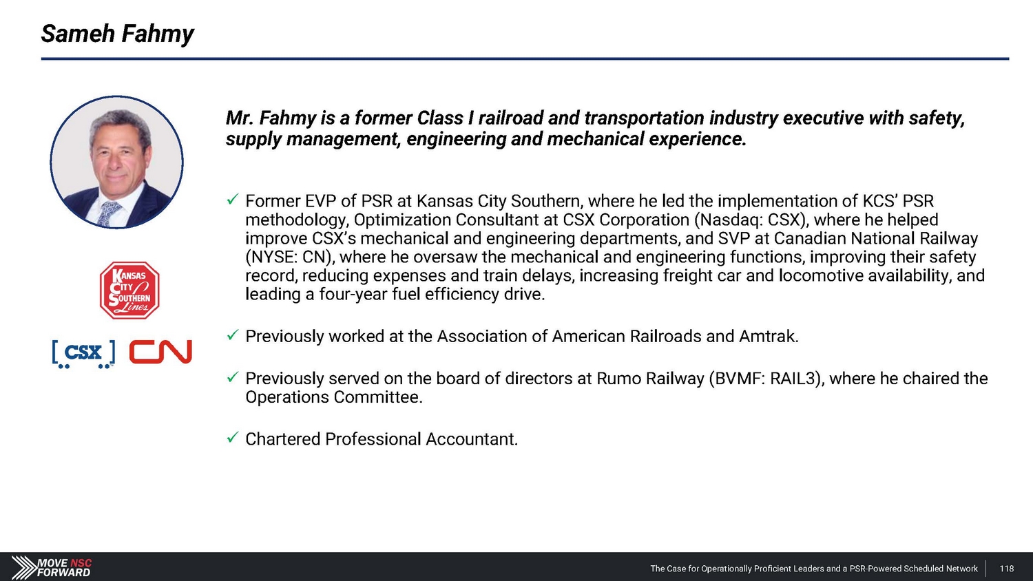 Sameh Fahmy Mr. Fahmy is a former Class I railroad and transportation industry executive with safety, supply management, engineering and mechanical experience. x Former EVP of PSR at Kansas City Southern, where he led the implementation of KCS’ PSR methodology, Optimization Consultant at CSX Corporation (Nasdaq: CSX), where he helped improve CSX’s mechanical and engineering departments, and SVP at Canadian National Railway (NYSE: CN), where he oversaw the mechanical and engineering functions, improving their safety record, reducing expenses and train delays, increasing freight car and locomotive availability, and leading a four - year fuel efficiency drive. x Previously worked at the Association of American Railroads and Amtrak. x Previously served on the board of directors at Rumo Railway (BVMF: RAIL3), where he chaired the Operations Committee. x Chartered Professional Accountant. The Case for Operationally Proficient Leaders and a PSR - Powered Scheduled Network 118