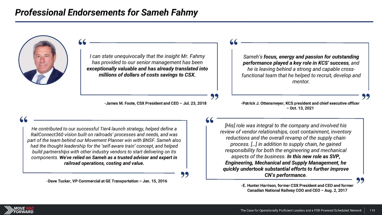 Professional Endorsements for Sameh Fahmy I can state unequivocally that the insight Mr. Fahmy has provided to our senior management has been exceptionally valuable and has already translated into millions of dollars of costs savings to CSX. [His] role was integral to the company and involved his review of vendor relationships, cost containment, inventory reductions and the overall revamp of the supply chain process. […] in addition to supply chain, he gained responsibility for both the engineering and mechanical aspects of the business. In this new role as SVP, Engineering, Mechanical and Supply Management, he quickly undertook substantial efforts to further improve CN’s performance . He contributed to our successful Tier4 launch strategy, helped define a RailConnect360 vision built on railroads' processes and needs, and was part of the team behind our Movement Planner win with BNSF. Sameh also had the thought leadership for the ‘self - aware train’ concept, and helped build partnerships with other industry vendors to start delivering on its components. We've relied on Sameh as a trusted advisor and expert in railroad operations, costing and value. Sameh’s focus, energy and passion for outstanding performance played a key role in KCS’ success , and he is leaving behind a strong and capable cross - functional team that he helped to recruit, develop and mentor. - E. Hunter Harrison, former CSX President and CEO and former Canadian National Railway COO and CEO – Aug. 2, 2017 “ “ “ “ The Case for Operationally Proficient Leaders and a PSR - Powered Scheduled Network 119 - James M. Foote, CSX President and CEO – Jul. 23, 2018 - Patrick J. Ottensmeyer, KCS president and chief executive officer – Oct. 13, 2021 - Dave Tucker, VP Commercial at GE Transportation – Jan. 15, 2016