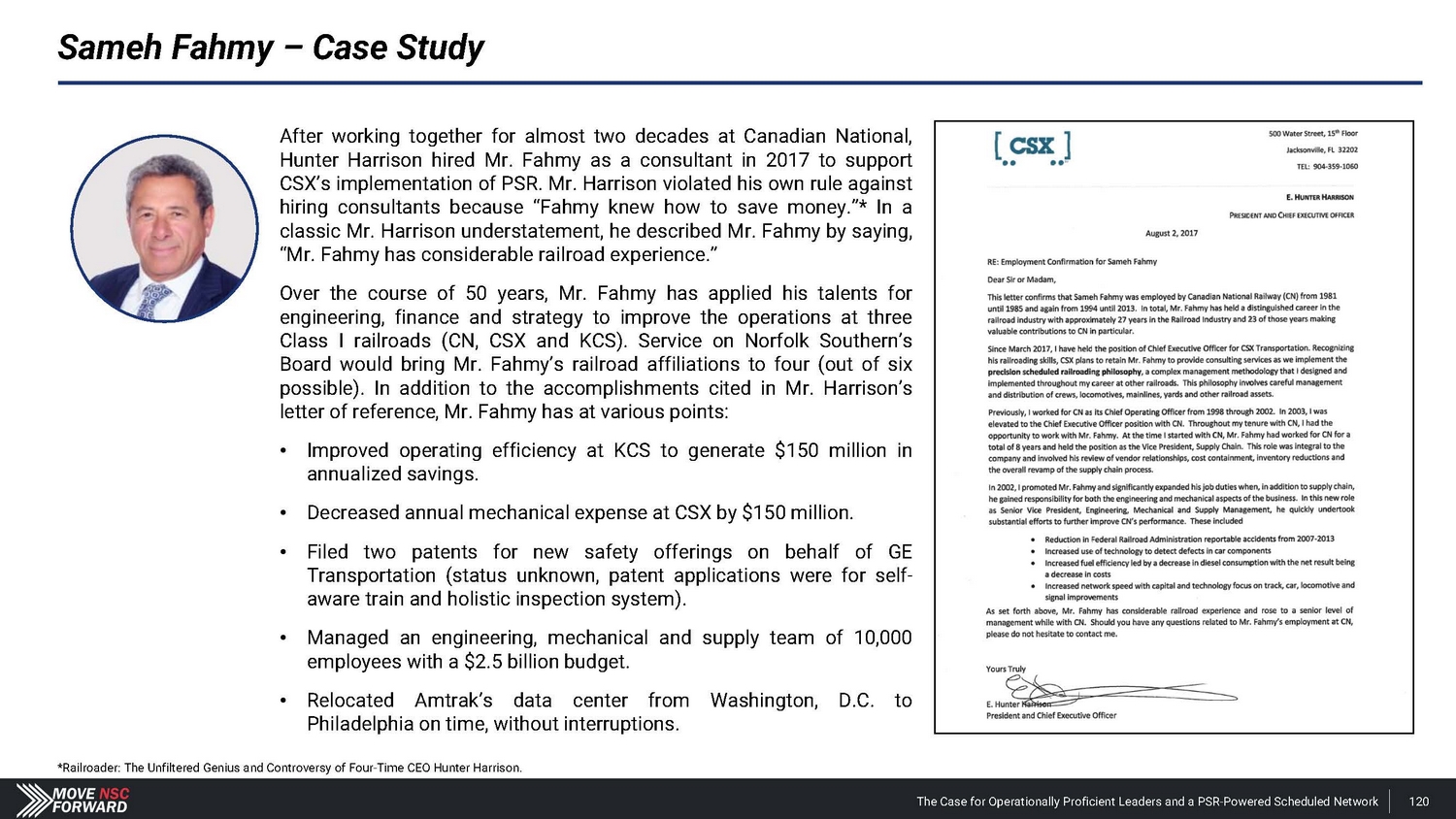 Sameh Fahmy – Case Study *Railroader: The Unfiltered Genius and Controversy of Four - Time CEO Hunter Harrison. After working together for almost two decades at Canadian National, Hunter Harrison hired Mr . Fahmy as a consultant in 2017 to support CSX’s implementation of PSR . Mr . Harrison violated his own rule against hiring consultants because “Fahmy knew how to save money . ”* In a classic Mr . Harrison understatement, he described Mr . Fahmy by saying, “Mr . Fahmy has considerable railroad experience . ” Over the course of 50 years, Mr . Fahmy has applied his talents for engineering, finance and strategy to improve the operations at three Class I railroads (CN, CSX and KCS) . Service on Norfolk Southern’s Board would bring Mr . Fahmy’s railroad affiliations to four (out of six possible) . In addition to the accomplishments cited in Mr . Harrison’s letter of reference, Mr . Fahmy has at various points : • Improved operating efficiency at KCS to generate $ 150 million in annualized savings . • Decreased annual mechanical expense at CSX by $150 million. • Filed two patents for new safety offerings on behalf of GE Transportation (status unknown, patent applications were for self - aware train and holistic inspection system) . • Managed an engineering, mechanical and supply team of 10 , 000 employees with a $ 2 . 5 billion budget . • Relocated Amtrak’s data center from Washington, D . C . to Philadelphia on time, without interruptions . The Case for Operationally Proficient Leaders and a PSR - Powered Scheduled Network 120