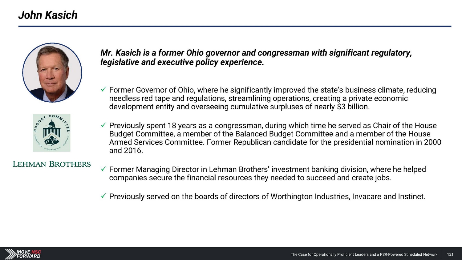 John Kasich Mr. Kasich is a former Ohio governor and congressman with significant regulatory, legislative and executive policy experience. x Former Governor of Ohio, where he significantly improved the state’s business climate, reducing needless red tape and regulations, streamlining operations, creating a private economic development entity and overseeing cumulative surpluses of nearly $3 billion. x Previously spent 18 years as a congressman, during which time he served as Chair of the House Budget Committee, a member of the Balanced Budget Committee and a member of the House Armed Services Committee. Former Republican candidate for the presidential nomination in 2000 and 2016. x Former Managing Director in Lehman Brothers’ investment banking division, where he helped companies secure the financial resources they needed to succeed and create jobs. x Previously served on the boards of directors of Worthington Industries, Invacare and Instinet. The Case for Operationally Proficient Leaders and a PSR - Powered Scheduled Network 121