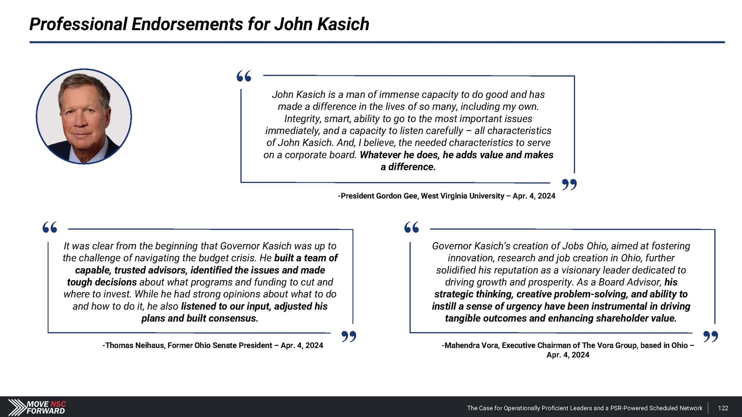 Professional Endorsements for John Kasich Governor Kasich’s creation of Jobs Ohio, aimed at fostering innovation, research and job creation in Ohio, further solidified his reputation as a visionary leader dedicated to driving growth and prosperity. As a Board Advisor, his strategic thinking, creative problem - solving, and ability to instill a sense of urgency have been instrumental in driving tangible outcomes and enhancing shareholder value. John Kasich is a man of immense capacity to do good and has made a difference in the lives of so many, including my own. Integrity, smart, ability to go to the most important issues immediately, and a capacity to listen carefully – all characteristics of John Kasich. And, I believe, the needed characteristics to serve on a corporate board. Whatever he does, he adds value and makes a difference. the challenge of navigating the budget crisis. He built a team of capable, trusted advisors, identified the issues and made tough decisions about what programs and funding to cut and where to invest. While he had strong opinions about what to do and how to do it, he also listened to our input, adjusted his plans and built consensus. “ “ It was clear from the beginning that Governor Kasich was up to “ The Case for Operationally Proficient Leaders and a PSR - Powered Scheduled Network 122 - President Gordon Gee, West Virginia University – Apr. 4, 2024 - Thomas Neihaus, Former Ohio Senate President – Apr. 4, 2024 - Mahendra Vora, Executive Chairman of The Vora Group, based in Ohio – Apr. 4, 2024