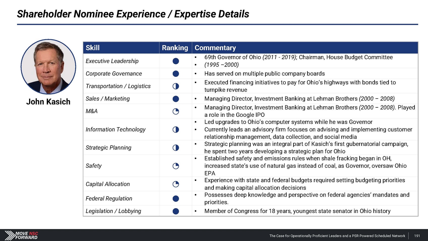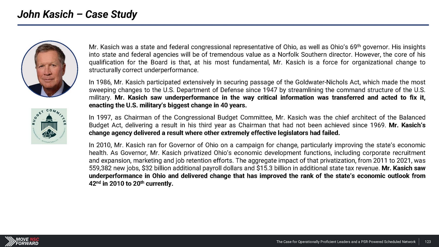 John Kasich – Case Study Mr . Kasich was a state and federal congressional representative of Ohio, as well as Ohio’s 69 th governor . His insights into state and federal agencies will be of tremendous value as a Norfolk Southern director . However, the core of his qualification for the Board is that, at his most fundamental, Mr . Kasich is a force for organizational change to structurally correct underperformance . In 1986 , Mr . Kasich participated extensively in securing passage of the Goldwater - Nichols Act, which made the most sweeping changes to the U . S . Department of Defense since 1947 by streamlining the command structure of the U . S . military . Mr . Kasich saw underperformance in the way critical information was transferred and acted to fix it, enacting the U . S . military’s biggest change in 40 years . In 1997 , as Chairman of the Congressional Budget Committee, Mr . Kasich was the chief architect of the Balanced Budget Act, delivering a result in his third year as Chairman that had not been achieved since 1969 . Mr . Kasich’s change agency delivered a result where other extremely effective legislators had failed . In 2010 , Mr . Kasich ran for Governor of Ohio on a campaign for change, particularly improving the state’s economic health . As Governor, Mr . Kasich privatized Ohio’s economic development functions, including corporate recruitment and expansion, marketing and job retention efforts . The aggregate impact of that privatization, from 2011 to 2021 , was 559 , 382 new jobs, $ 32 billion additional payroll dollars and $ 15 . 3 billion in additional state tax revenue . Mr . Kasich saw underperformance in Ohio and delivered change that has improved the rank of the state’s economic outlook from 42 nd in 2010 to 20 th currently . The Case for Operationally Proficient Leaders and a PSR - Powered Scheduled Network 123