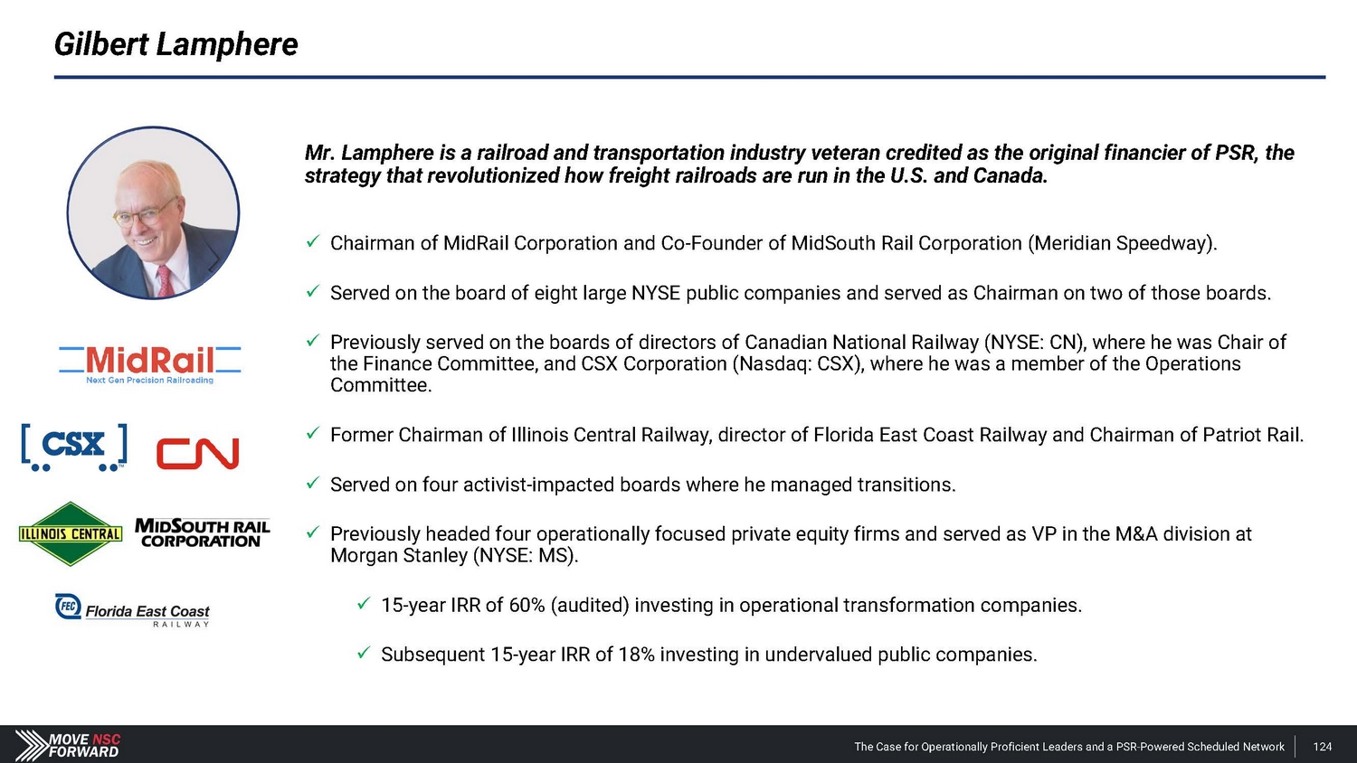 Gilbert Lamphere Mr. Lamphere is a railroad and transportation industry veteran credited as the original financier of PSR, the strategy that revolutionized how freight railroads are run in the U.S. and Canada. x Chairman of MidRail Corporation and Co - Founder of MidSouth Rail Corporation (Meridian Speedway). x Served on the board of eight large NYSE public companies and served as Chairman on two of those boards. x Previously served on the boards of directors of Canadian National Railway (NYSE: CN), where he was Chair of the Finance Committee, and CSX Corporation (Nasdaq: CSX), where he was a member of the Operations Committee. x Former Chairman of Illinois Central Railway, director of Florida East Coast Railway and Chairman of Patriot Rail. x Served on four activist - impacted boards where he managed transitions. x Previously headed four operationally focused private equity firms and served as VP in the M&A division at Morgan Stanley (NYSE: MS). x 15 - year IRR of 60% (audited) investing in operational transformation companies. x Subsequent 15 - year IRR of 18% investing in undervalued public companies. The Case for Operationally Proficient Leaders and a PSR - Powered Scheduled Network 124