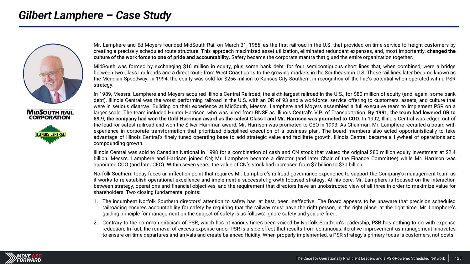 Gilbert Lamphere – Case Study Mr . Lamphere and Ed Moyers founded MidSouth Rail on March 31 , 1986 , as the first railroad in the U . S . that provided on - time service to freight customers by creating a precisely scheduled route structure . This approach maximized asset utilization, eliminated redundant expenses, and, most importantly, changed the culture of the work force to one of pride and accountability . Safety became the corporate mantra that glued the entire organization together . MidSouth was formed by exchanging $ 16 million in equity, plus some bank debt, for four semicontiguous short lines that, when combined, were a bridge between two Class I railroads and a direct route from West Coast ports to the growing markets in the Southeastern U . S . Those rail lines later became known as the Meridian Speedway . In 1994 , the equity was sold for $ 256 million to Kansas City Southern, in recognition of the line’s potential when operated with a PSR strategy . In 1989 , Messrs . Lamphere and Moyers acquired Illinois Central Railroad, the sixth - largest railroad in the U . S . , for $ 80 million of equity (and, again, some bank debt) . Illinois Central was the worst performing railroad in the U . S . with an OR of 93 and a workforce, service offering to customers, assets, and culture that were in serious disarray . Building on their experience at MidSouth, Messrs . Lamphere and Moyers assembled a full executive team to implement PSR on a larger scale . The team included Hunter Harrison, who was hired from BNSF as Illinois Central’s V . P . of Transportation . By 1991 , the team had lowered OR to 59 . 9 , the company had won the Gold Harriman award as the safest Class I and Mr . Harrison was promoted to COO . In 1992 , Illinois Central was edged out of the lead for safest railroad and won the Silver Harriman award ; Mr . Harrison was promoted to CEO in 1993 . As Chairman, Mr . Lamphere recruited a board with experience in corporate transformation that prioritized disciplined execution of a business plan . The board members also acted opportunistically to take advantage of Illinois Central’s finely tuned operating base to add strategic value and facilitate growth . Illinois Central became a flywheel of operations and compounding growth . Illinois Central was sold to Canadian National in 1998 for a combination of cash and CN stock that valued the original $ 80 million equity investment at $ 2 . 4 billion . Messrs . Lamphere and Harrison joined CN ; Mr . Lamphere became a director (and later Chair of the Finance Committee) while Mr . Harrison was appointed COO (and later CEO) . Within seven years, the value of CN’s stock had increased from $ 7 billion to $ 30 billion . Norfolk Southern today faces an inflection point that requires Mr . Lamphere’s railroad governance experience to support the Company’s management team as it works to re - establish operational excellence and implement a successful growth - focused strategy . At his core, Mr . Lamphere is focused on the interaction between strategy, operations and financial objectives, and the requirement that directors have an unobstructed view of all three in order to maximize value for shareholders . Two closing fundamental points : 1. The incumbent Norfolk Southern directors’ attention to safety has, at best, been ineffective . The Board appears to be unaware that precision scheduled railroading ensures accountability for safety by requiring that the railway must have the right person, in the right place, at the right time . Mr . Lamphere’s guiding principle for management on the subject of safety is as follows : Ignore safety and you are fired . 2. Contrary to the common criticism of PSR, which has at various times been voiced by Norfolk Southern’s leadership, PSR has nothing to do with expense reduction . In fact, the removal of excess expense under PSR is a side effect that results from continuous, iterative improvement as management innovates to ensure on - time departures and arrivals and create balanced fluidity . When properly implemented, a PSR strategy’s primary focus is customers, not costs . The Case for Operationally Proficient Leaders and a PSR - Powered Scheduled Network 125