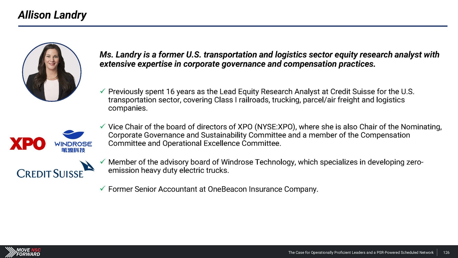 Allison Landry Allison Landry, age 44 , currently serves on the Board of Directors of XPO, Inc . where she is Chair of the Nominating, Corporate Governance and Sustainability Committee and a member of the Compensation Committee and Operational Excellence Committee . Additionally, she serves as a Strategic Advisor and member of the Windrose Technology Advisory Board . Prior to that, Ms . Landry spent 16 years at Credit Suisse, where she was the lead equity research analyst for the U . S . Transportation sector, covering Class I railroads, trucking, parcel/airfreight and logistics . Ms . Landry holds a B . A . from College of the Holy Cross in Psychology and an M . B . A . from Boston University’s Questrom School of Business . Ms . Landry’s qualifications include, among other things, her significant experience in the transportation sector, equity markets and research and analysis from more than 15 years working in investments, financial analysis and valuation . Ms . Landry would be a valuable addition to the Board given her extensive corporate governance, compensation and finance experience in the transportation and logistics industries . The Case for Operationally Proficient Leaders and a PSR - Powered Scheduled Network 179