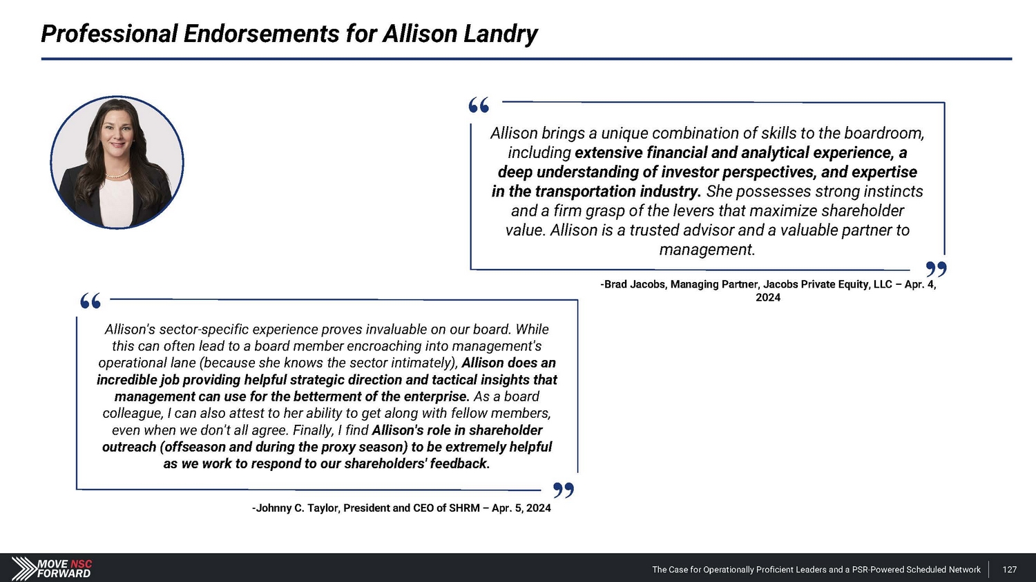 Professional Endorsements for Allison Landry Allison brings a unique combination of skills to the boardroom, including extensive financial and analytical experience, a deep understanding of investor perspectives, and expertise in the transportation industry. She possesses strong instincts and a firm grasp of the levers that maximize shareholder value. Allison is a trusted advisor and a valuable partner to management. “ “ The Case for Operationally Proficient Leaders and a PSR - Powered Scheduled Network 127 - Brad Jacobs, Managing Partner, Jacobs Private Equity, LLC – Apr. 4, 2024 Allison's sector - specific experience proves invaluable on our board. While this can often lead to a board member encroaching into management's operational lane (because she knows the sector intimately), Allison does an incredible job providing helpful strategic direction and tactical insights that management can use for the betterment of the enterprise. As a board colleague, I can also attest to her ability to get along with fellow members, even when we don't all agree. Finally, I find Allison's role in shareholder outreach (offseason and during the proxy season) to be extremely helpful as we work to respond to our shareholders' feedback. - Johnny C. Taylor, President and CEO of SHRM – Apr. 5, 2024