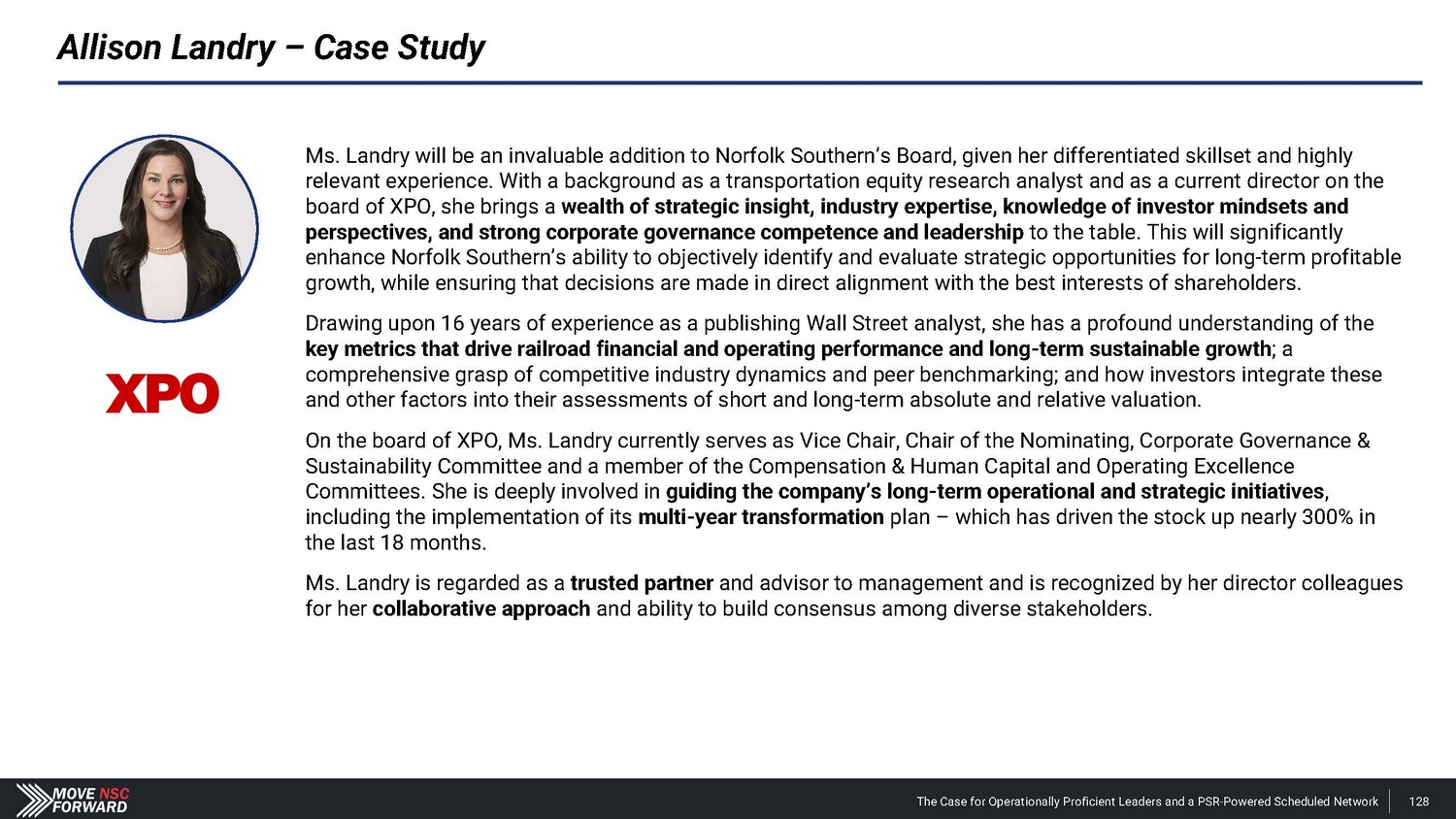 Allison Landry – Case Study Ms. Landry will be an invaluable addition to Norfolk Southern’s Board, given her differentiated skillset and highly relevant experience. With a background as a transportation equity research analyst and as a current director on the board of XPO, she brings a wealth of strategic insight, industry expertise, knowledge of investor mindsets and perspectives, and strong corporate governance competence and leadership to the table. This will significantly enhance Norfolk Southern’s ability to objectively identify and evaluate strategic opportunities for long - term profitable growth, while ensuring that decisions are made in direct alignment with the best interests of shareholders. Drawing upon 16 years of experience as a publishing Wall Street analyst, she has a profound understanding of the key metrics that drive railroad financial and operating performance and long - term sustainable growth ; a comprehensive grasp of competitive industry dynamics and peer benchmarking; and how investors integrate these and other factors into their assessments of short and long - term absolute and relative valuation. On the board of XPO, Ms. Landry currently serves as Vice Chair, Chair of the Nominating, Corporate Governance & Sustainability Committee and a member of the Compensation & Human Capital and Operating Excellence Committees. She is deeply involved in guiding the company’s long - term operational and strategic initiatives , including the implementation of its multi - year transformation plan – which has driven the stock up nearly 300% in the last 18 months. Ms. Landry is regarded as a trusted partner and advisor to management and is recognized by her director colleagues for her collaborative approach and ability to build consensus among diverse stakeholders. The Case for Operationally Proficient Leaders and a PSR - Powered Scheduled Network 128