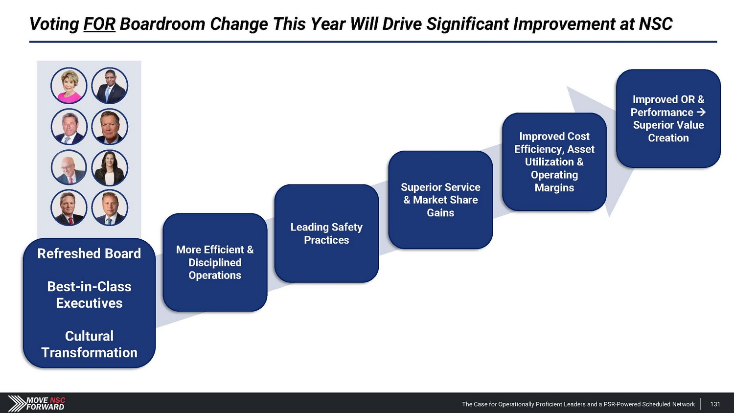 Voting FOR Boardroom Change This Year Will Drive Significant Improvement at NSC Superior Service & Market Share Gains More Efficient & Disciplined Operations Leading Safety Practices Improved Cost Efficiency, Asset Utilization & Operating Margins Improved OR & Performance Superior Value Creation Refreshed Board Bes t - in - Class Executives Cultural Transforma t ion The Case for Operationally Proficient Leaders and a PSR - Powered Scheduled Network 131