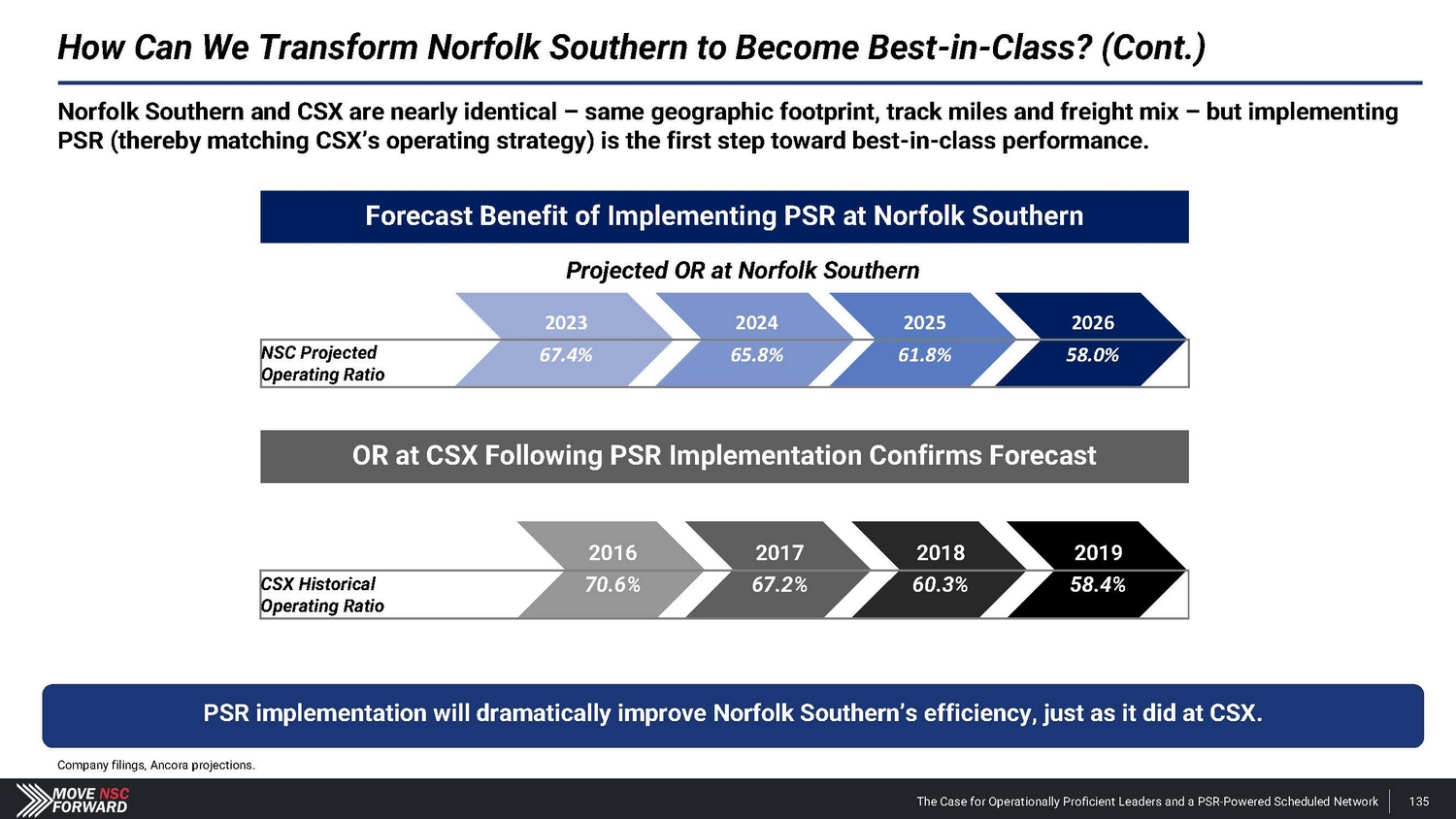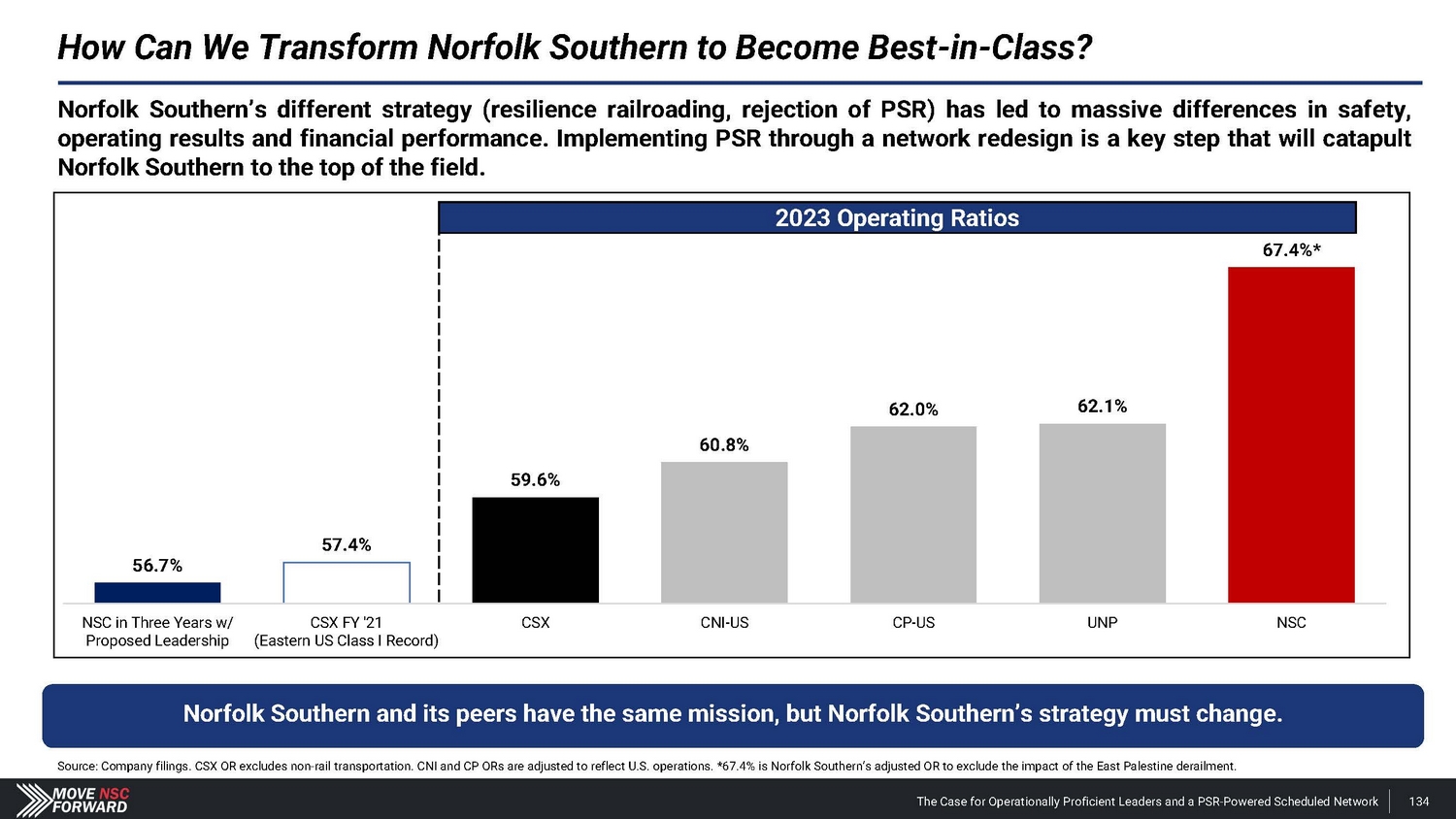 How Can We Transform Norfolk Southern to Become Best - in - Class? Norfolk Southern and its peers have the same mission, but Norfolk Southern’s strategy must change. Source: Company filings. CSX OR excludes non - rail transportation. CNI and CP ORs are adjusted to reflect U.S. operations. *67.4% is Norfolk Southern’s adjusted OR to exclude the impact of the East Palestine derailment. 56.7% 57.4% 59.6% 60.8% 62.0% 62.1% NSC in Three Years w/ Proposed Leadership CSX FY '21 (Eastern US Class I Record) CSX C N I - US CP - US UNP NSC Norfolk Southern’s different strategy (resilience railroading, rejection of PSR) has led to massive differences in safety, operating results and financial performance . Implementing PSR through a network redesign is a key step that will catapult Norfolk Southern to the top of the field . 2023 Operating Ratios 67.4 % * The Case for Operationally Proficient Leaders and a PSR - Powered Scheduled Network 134