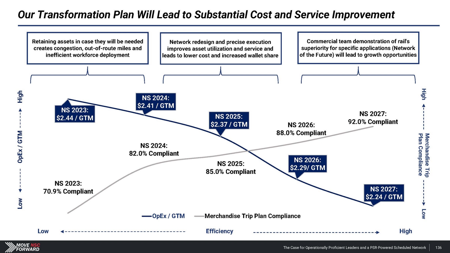 Our Transformation Plan Will Lead to Substantial Cost and Service Improvement Merchandise Trip Plan Compliance Hig h Lo w Lo w OpEx / GTM H i g h Low Efficiency Hi gh Retaining assets in case they will be needed creates congestion, out - of - route miles and inefficient workforce deployment Network redesign and precise execution improves asset utilization and service and leads to lower cost and increased wallet share Commercial team demonstration of rail's superiority for specific applications (Network of the Future) will lead to growth opportunities NS 2023: $2.44 / GTM NS 2024: $2.41 / GTM NS 2025: $2.37 / GTM NS 2026: $2.29/ GTM NS 2027: $2.24 / GTM NS 2023: 70.9% Compliant NS 2024: 82.0% Compliant NS 2025: 85.0% Compliant NS 2026: 88.0% Compliant NS 2027: 92.0% Compliant OpEx / GTM Merchandise Trip Plan Compliance The Case for Operationally Proficient Leaders and a PSR - Powered Scheduled Network 136