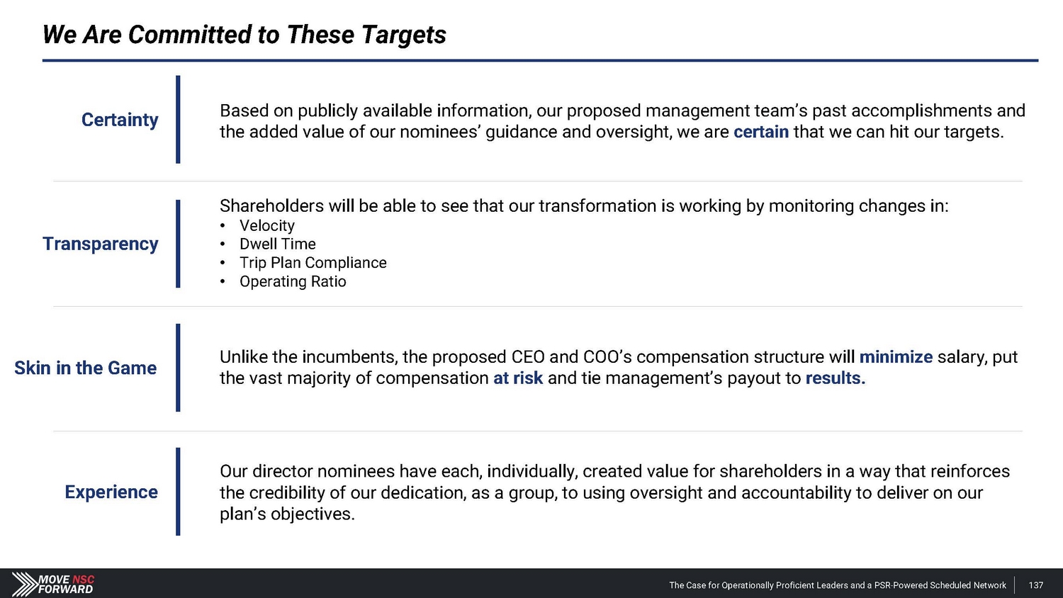 We Are Committed to These Targets Based on publicly available information, our proposed management team’s past accomplishments and the added value of our nominees’ guidance and oversight, we are certain that we can hit our targets. Certainty Transparency Skin in the Game Experience Shareholders will be able to see that our transformation is working by monitoring changes in: • Velocity • Dwell Time • Trip Plan Compliance • Operating Ratio Unlike the incumbents, the proposed CEO and COO’s compensation structure will minimize salary, put the vast majority of compensation at risk and tie management’s payout to results. Our director nominees have each, individually, created value for shareholders in a way that reinforces the credibility of our dedication, as a group, to using oversight and accountability to deliver on our plan’s objectives. The Case for Operationally Proficient Leaders and a PSR - Powered Scheduled Network 137