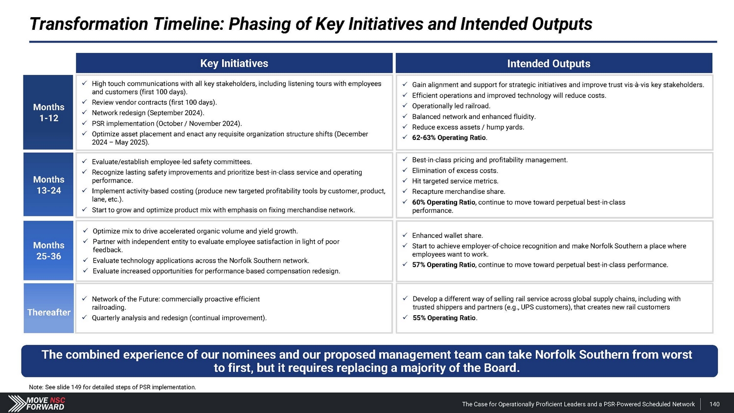Intended Outputs x Gain alignment and support for strategic initiatives and improve trust vis - à - vis key stakeholders. x Efficient operations and improved technology will reduce costs. x Operationally led railroad. x Balanced network and enhanced fluidity. x Reduce excess assets / hump yards. x 62 - 63% Operating Ratio . x Best - in - class pricing and profitability management. x Elimination of excess costs. x Hit targeted service metrics. x Recapture merchandise share. x 60% Operating Ratio , continue to move toward perpetual best - in - class performance. x Enhanced wallet share. x Start to achieve employer - of - choice recognition and make Norfolk Southern a place where employees want to work. x 57% Operating Ratio , continue to move toward perpetual best - in - class performance. x Develop a different way of selling rail service across global supply chains, including with trusted shippers and partners (e.g., UPS customers), that creates new rail customers x 55% Operating Ratio . Key Initiatives x High touch communications with all key stakeholders, including listening tours with employees and customers (first 100 days). x Review vendor contracts (first 100 days). x Network redesign (September 2024). x PSR implementation (October / November 2024). x Optimize asset placement and enact any requisite organization structure shifts (December 2024 – May 2025). x Evaluate/establish employee - led safety committees. x Recognize lasting safety improvements and prioritize best - in - class service and operating performance. x Implement activity - based costing (produce new targeted profitability tools by customer, product, lane, etc.). x Start to grow and optimize product mix with emphasis on fixing merchandise network. x Optimize mix to drive accelerated organic volume and yield growth. x Partner with independent entity to evaluate employee satisfaction in light of poor feedback. x Evaluate technology applications across the Norfolk Southern network. x Evaluate increased opportunities for performance - based compensation redesign. x Network of the Future: commercially proactive efficient railroading. x Quarterly analysis and redesign (continual improvement). Transformation Timeline: Phasing of Key Initiatives and Intended Outputs The combined experience of our nominees and our proposed management team can take Norfolk Southern from worst to first, but it requires replacing a majority of the Board. Months 1 - 12 Note: See slide 149 for detailed steps of PSR implementation. The Case for Operationally Proficient Leaders and a PSR - Powered Scheduled Network 140 Months 13 - 24 Months 25 - 36 Thereafter