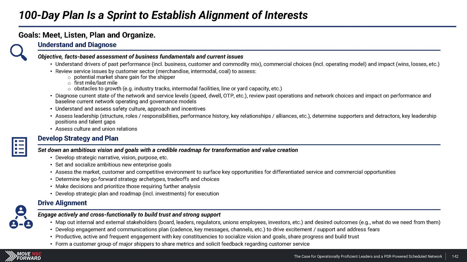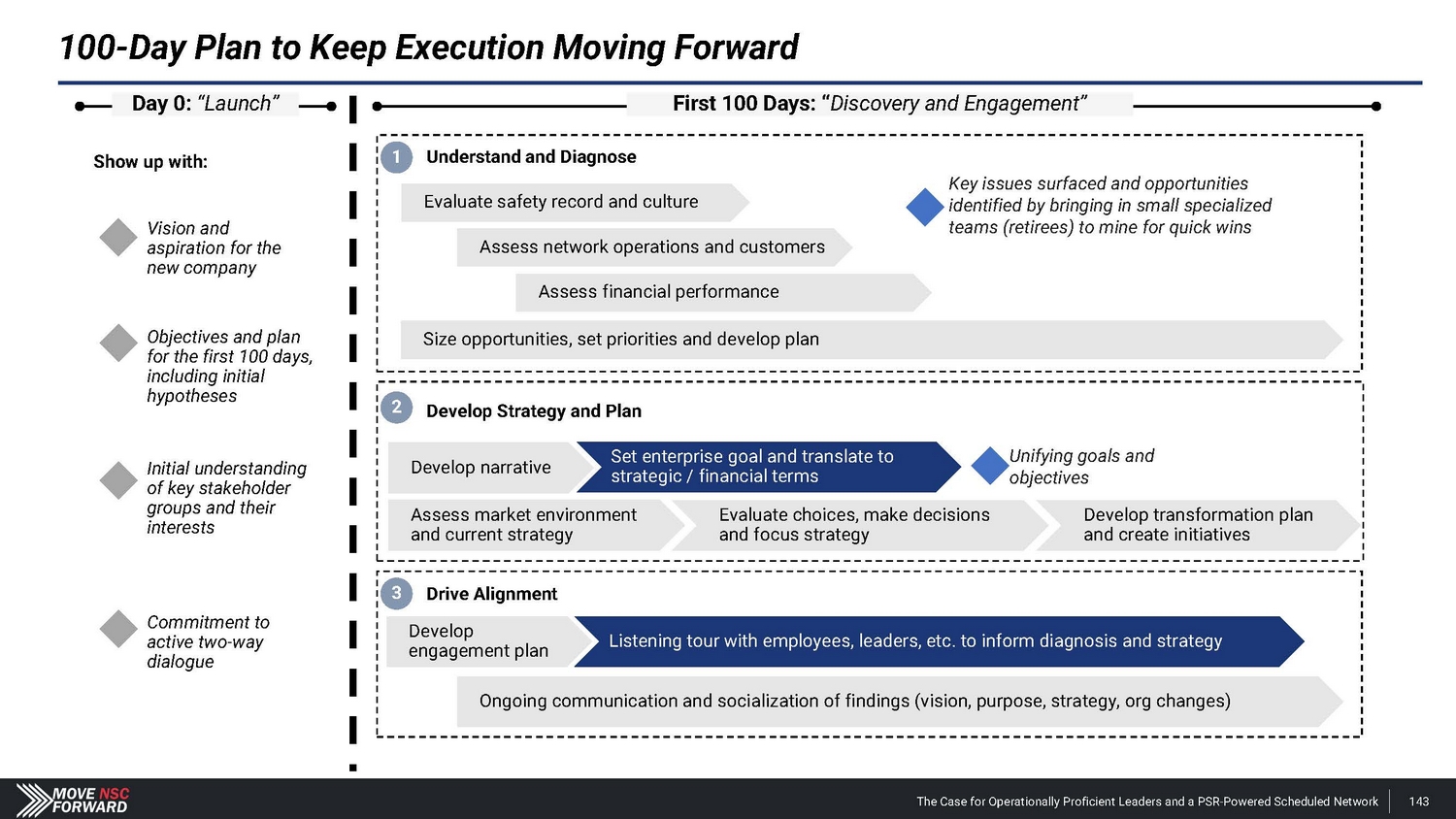 100 - Day Plan to Keep Execution Moving Forward Day 0: “Launch” Key issues surfaced and opportunities identified by bringing in small specialized teams (retirees) to mine for quick wins Objectives and plan for the first 100 days, including initial hypotheses First 100 Days: “ Discovery and Engagement” Assess network operations and customers Assess financial performance Size opportunities, set priorities and develop plan Develop narrative 1 Understand and Diagnose Evaluate safety record and culture 2 Develop Strategy and Plan 3 Drive Alignment Vision and aspiration for the new company Commitment to active two - way dialogue Initial understanding of key stakeholder groups and their interests Listening tour with employees, leaders, etc. to inform diagnosis and strategy Develop engagement plan Assess market environment and current strategy Set enterprise goal and translate to strategic / financial terms Unifying goals and objectives Evaluate choices, make decisions Develop transformation plan and focus strategy and create initiatives Ongoing communication and socialization of findings (vision, purpose, strategy, org changes) Show up with: The Case for Operationally Proficient Leaders and a PSR - Powered Scheduled Network 143