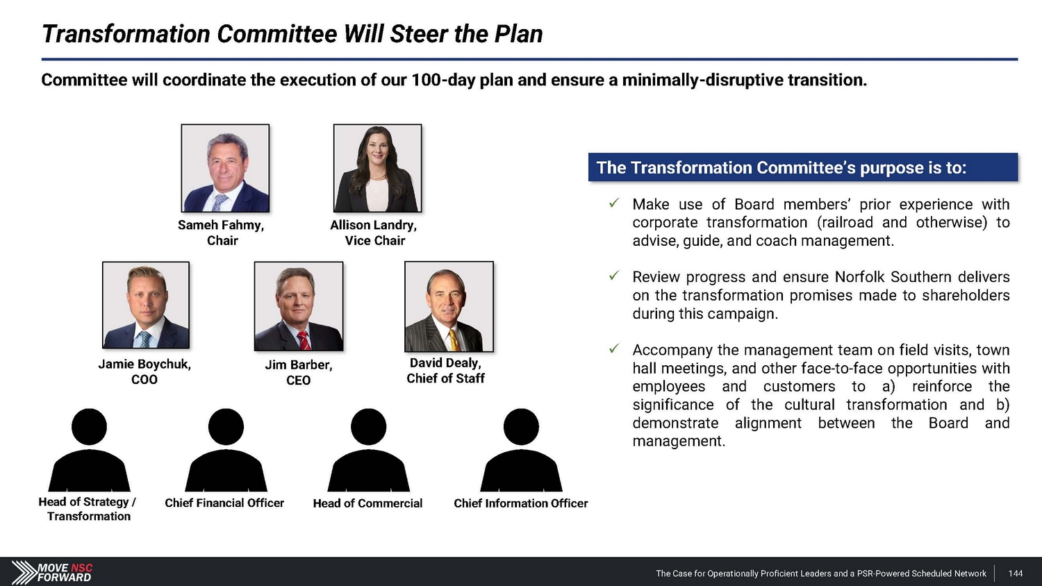 The Transformation Committee’s purpose is to: x Make use of Board members’ prior experience with corporate transformation (railroad and otherwise) to advise, guide, and coach management . x Review progress and ensure Norfolk Southern delivers on the transformation promises made to shareholders during this campaign . x Accompany the management team on field visits, town hall meetings, and other face - to - face opportunities with employees and customers to a) reinforce the significance of the cultural transformation and b) demonstrate alignment between the Board and management . Transformation Committee Will Steer the Plan Committee will coordinate the execution of our 100 - day plan and ensure a minimally - disruptive transition. Jim Barber, CEO Jamie Boychuk, COO David Dealy, Chief of Staff Sameh Fahmy, Chair Chief Financial Officer Chief Information Officer Head of Commercial Head of Strategy / Transformation Allison Landry, Vice Chair The Case for Operationally Proficient Leaders and a PSR - Powered Scheduled Network 144