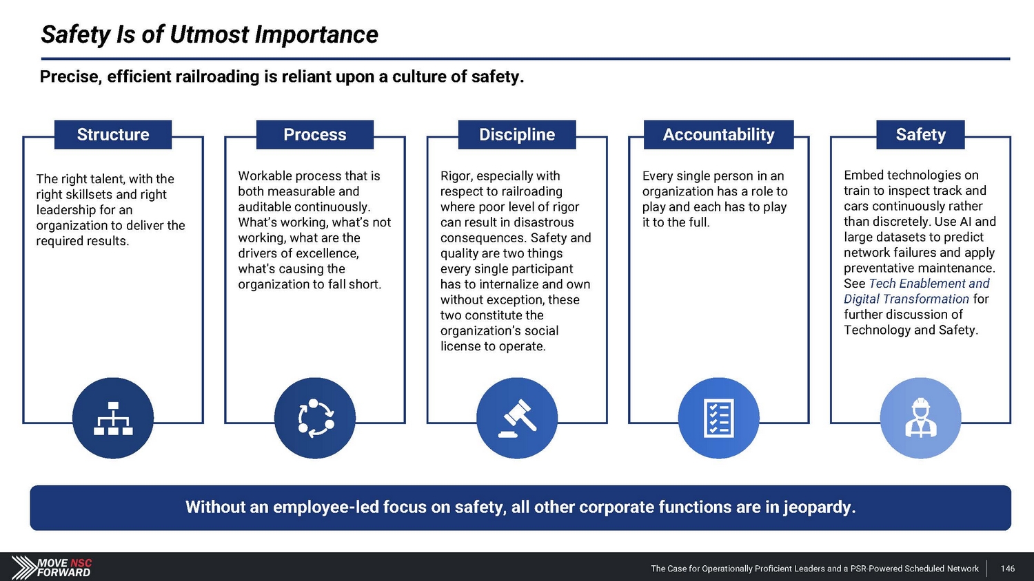 Safety Is of Utmost Importance Precise, efficient railroading is reliant upon a culture of safety. Without an employee - led focus on safety, all other corporate functions are in jeopardy. The right talent, with the right skillsets and right leadership for an organization to deliver the required results. Structure Workable process that is both measurable and auditable continuously. What’s working, what’s not working, what are the drivers of excellence, what’s causing the organization to fall short. Process Rigor, especially with respect to railroading where poor level of rigor can result in disastrous consequences. Safety and quality are two things every single participant has to internalize and own without exception, these two constitute the organization’s social license to operate. Discipline Every single person in an organization has a role to play and each has to play it to the full . Accountability Embed technologies on train to inspect track and cars continuously rather than discretely. Use AI and large datasets to predict network failures and apply preventative maintenance. See Tech Enablement and Digital Transformation for further discussion of Technology and Safety. Safety The Case for Operationally Proficient Leaders and a PSR - Powered Scheduled Network 146