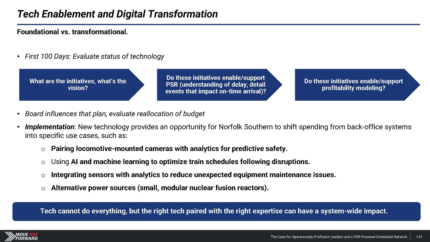 Tech Enablement and Digital Transformation Foundational vs. transformational. • First 100 Days: Evaluate status of technology • Board influences that plan, evaluate reallocation of budget • Implementation : New technology provides an opportunity for Norfolk Southern to shift spending from back - office systems into specific use cases, such as: o Pairing locomotive - mounted cameras with analytics for predictive safety. o Using AI and machine learning to optimize train schedules following disruptions. o Integrating sensors with analytics to reduce unexpected equipment maintenance issues. o Alternative power sources (small, modular nuclear fusion reactors). Tech cannot do everything, but the right tech paired with the right expertise can have a system - wide impact. What are the initiatives, what’s the vision? Do these initiatives enable/support PSR (understanding of delay, detail events that impact on - time arrival)? Do these initiatives enable/support profitability modeling? The Case for Operationally Proficient Leaders and a PSR - Powered Scheduled Network 147