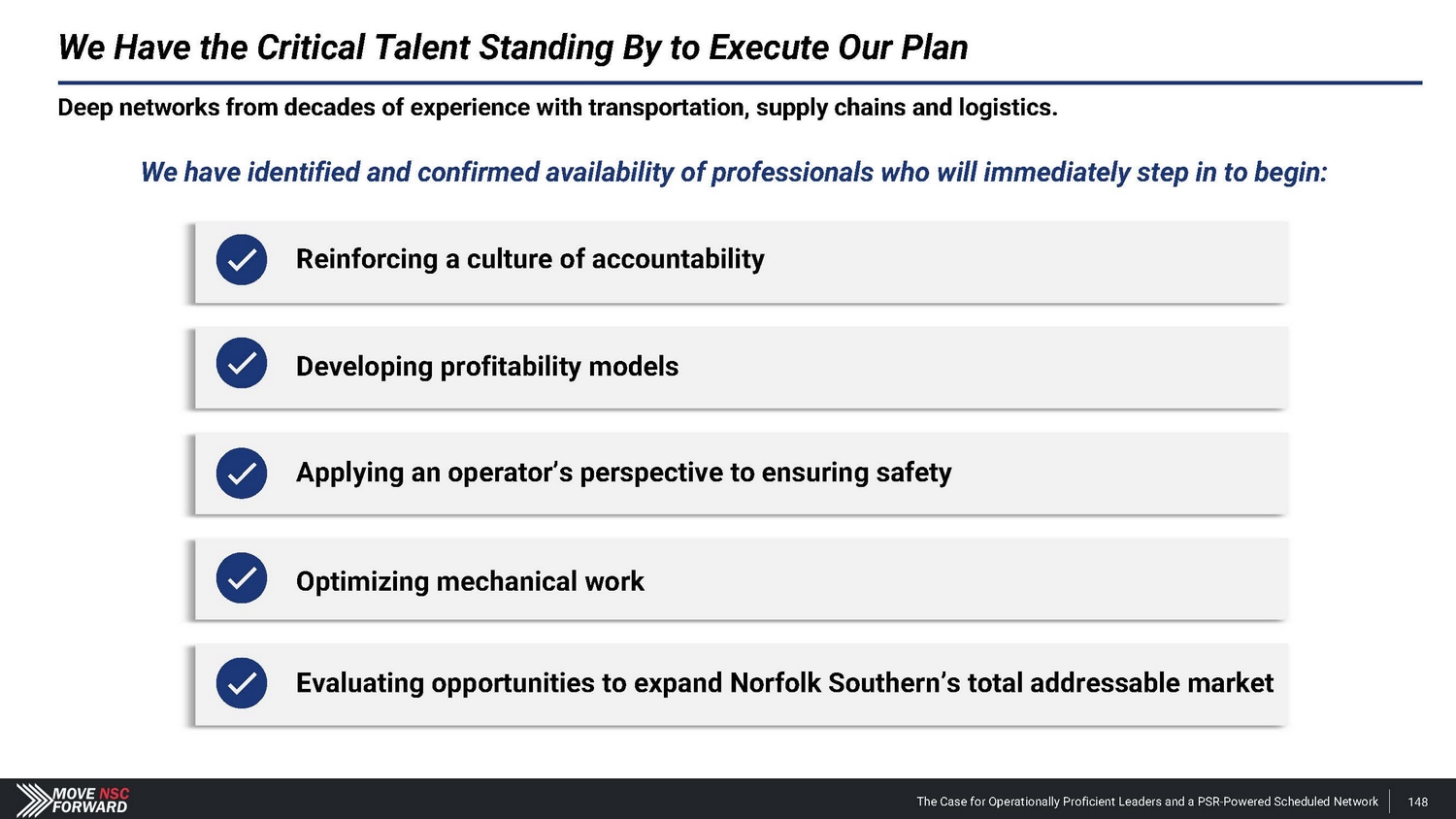 We Have the Critical Talent Standing By to Execute Our Plan Deep networks from decades of experience with transportation, supply chains and logistics. We have identified and confirmed availability of professionals who will immediately step in to begin: Reinforcing a culture of accountability Developing profitability models Applying an operator’s perspective to ensuring safety Optimizing mechanical work Evaluating opportunities to expand Norfolk Southern’s total addressable market The Case for Operationally Proficient Leaders and a PSR - Powered Scheduled Network 148