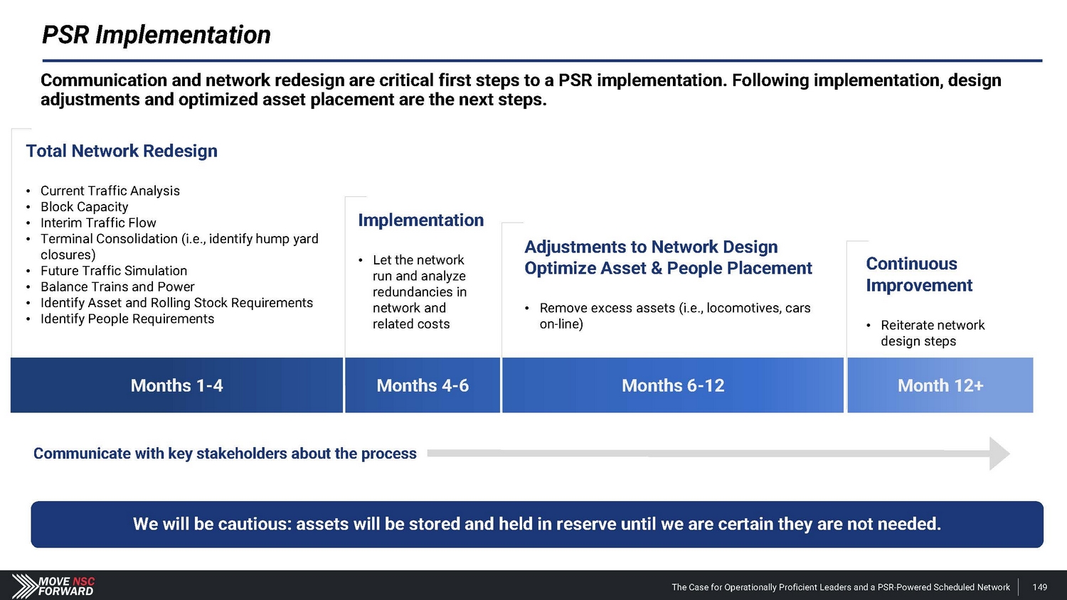 PSR Implementation We will be cautious: assets will be stored and held in reserve until we are certain they are not needed. Adjustments to Network Design Optimize Asset & People Placement • Remove excess assets (i.e., locomotives, cars on - line) Implementation • Let the network run and analyze redundancies in network and related costs Communication and network redesign are critical first steps to a PSR implementation. Following implementation, design adjustments and optimized asset placement are the next steps. Total Network Redesign • Current Traffic Analysis • Block Capacity • Interim Traffic Flow • Terminal Consolidation (i.e., identify hump yard closures) • Future Traffic Simulation • Balance Trains and Power • Identify Asset and Rolling Stock Requirements • Identify People Requirements Months 1 - 4 Months 4 - 6 Months 6 - 12 Month 12+ Continuous Improvement • Reiterate network design steps Communicate with key stakeholders about the process The Case for Operationally Proficient Leaders and a PSR - Powered Scheduled Network 149