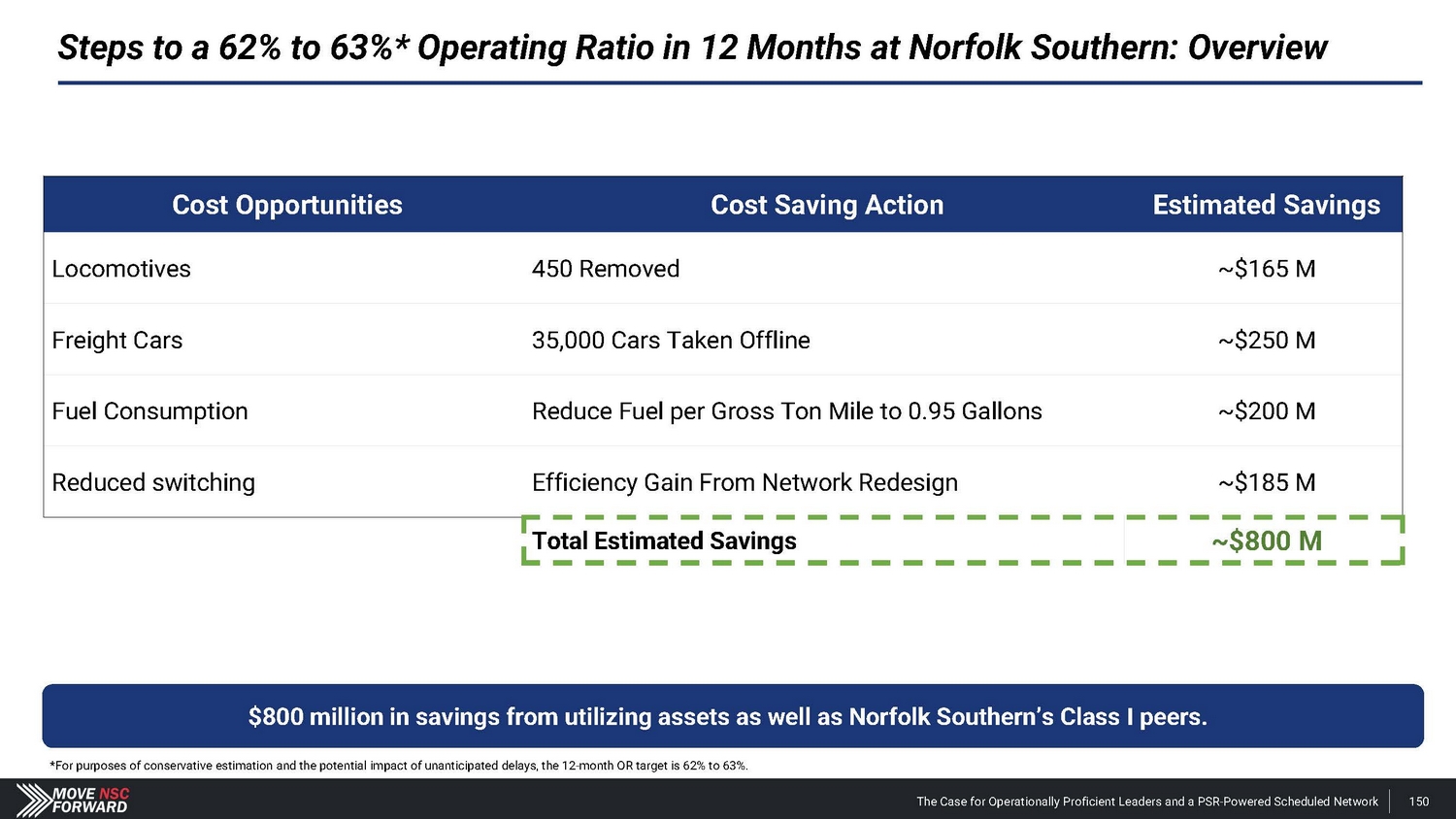 Steps to a 62% to 63%* Operating Ratio in 12 Months at Norfolk Southern: Overview The Case for Operationally Proficient Leaders and a PSR - Powered Scheduled Network 150 $800 million in savings from utilizing assets as well as Norfolk Southern’s Class I peers. Cost Opportunities Cost Saving Action Estimated Savings Locomotives 450 Removed ~$165 M Freight Cars 35,000 Cars Taken Offline ~$250 M Fuel Consumption Reduce Fuel per Gross Ton Mile to 0.95 Gallons ~$200 M Reduced switching Efficiency Gain From Network Redesign ~$185 M Total Estimated Savings ~$800 M *For purposes of conservative estimation and the potential impact of unanticipated delays, the 12 - month OR target is 62% to 63%.
