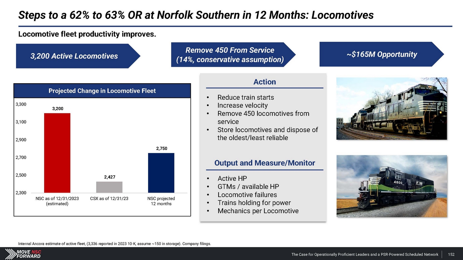 Locomotive fleet productivity improves. Steps to a 62% to 63% OR at Norfolk Southern in 12 Months: Locomotives Internal Ancora estimate of active fleet, (3,336 reported in 2023 10 - K, assume ~150 in storage). Company filings. 3,200 Active Locomotives Remove 450 From Service (14%, conservative assumption) ~$165M Opportunity Action • Reduce train starts • Increase velocity • Remove 450 locomotives from service • Store locomotives and dispose of the oldest/least reliable Output and Measure/Monitor • Active HP • GTMs / available HP • Locomotive failures • Trains holding for power • Mechanics per Locomotive Projected Change in Locomotive Fleet 3,300 3,200 3,100 2,900 2,750 2,700 2,500 2,427 2,300 NSC as of 12/31/2023 CSX as of 12/31/23 NSC projected (estimated) 12 months The Case for Operationally Proficient Leaders and a PSR - Powered Scheduled Network 152