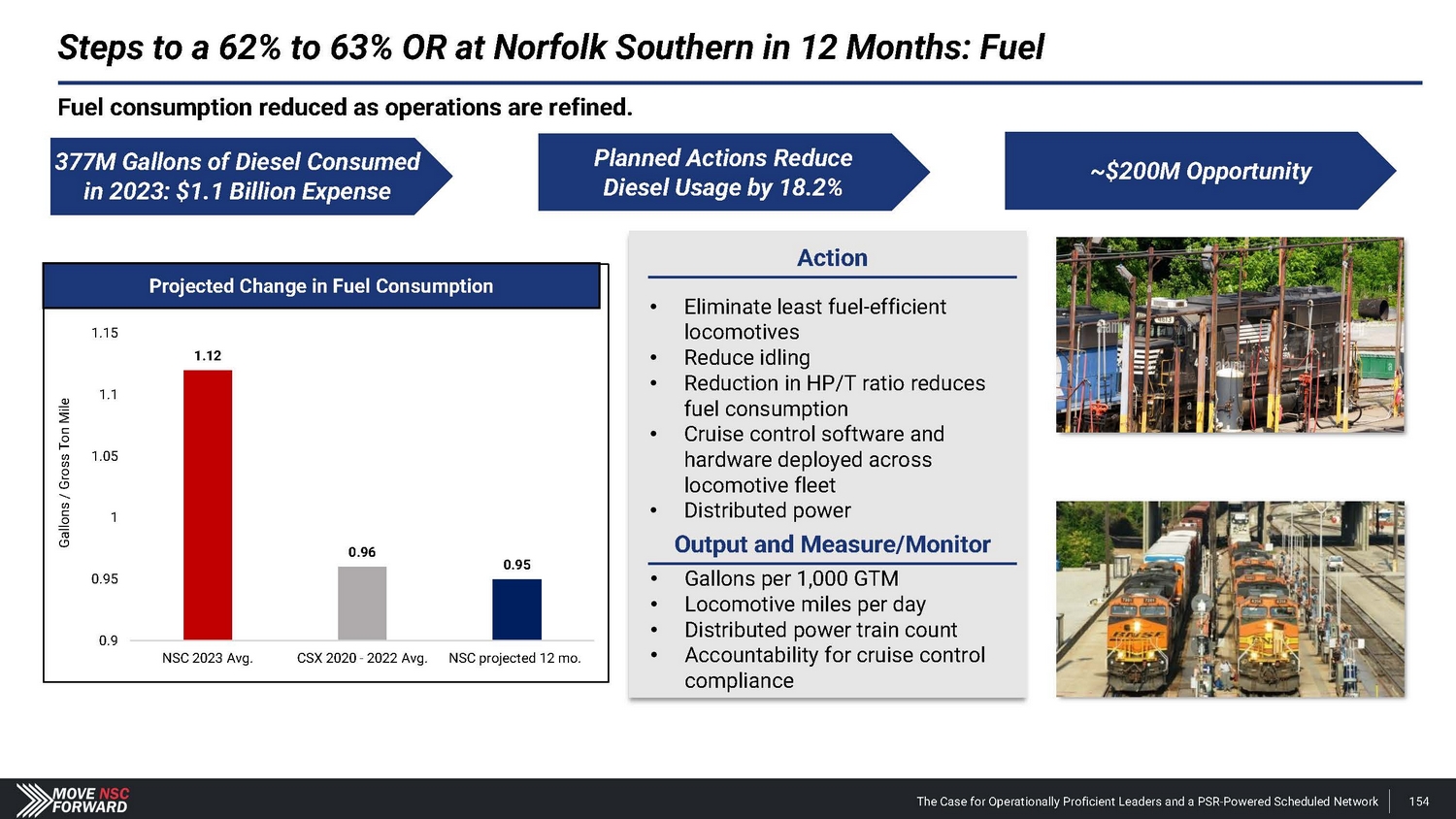 Gallons / Gross Ton Mile Projected Change in Fuel Consumption 1.15 1.12 1.1 1.05 1 0.96 0.95 0.95 0.9 NSC 2023 Avg. CSX 2020 - 2022 Avg. NSC projected 12 mo. Fuel consumption reduced as operations are refined. Steps to a 62% to 63% OR at Norfolk Southern in 12 Months: Fuel 377M Gallons of Diesel Consumed in 2023: $1.1 Billion Expense Planned Actions Reduce Diesel Usage by 18.2% ~$200M Opportunity Action • Eliminate least fuel - efficient locomotives • Reduce idling • Reduction in HP/T ratio reduces fuel consumption • Cruise control software and hardware deployed across locomotive fleet • Distributed power Output and Measure/Monitor • Gallons per 1,000 GTM • Locomotive miles per day • Distributed power train count • Accountability for cruise control compliance The Case for Operationally Proficient Leaders and a PSR - Powered Scheduled Network 154