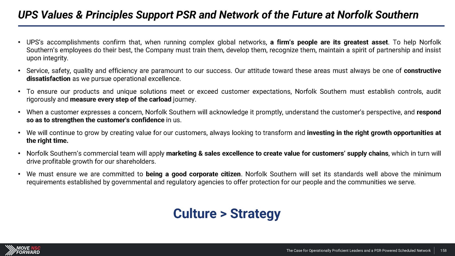 UPS Values & Principles Support PSR and Network of the Future at Norfolk Southern The Case for Operationally Proficient Leaders and a PSR - Powered Scheduled Network 158 • UPS’s accomplishments confirm that, when running complex global networks, a firm’s people are its greatest asset . To help Norfolk Southern’s employees do their best, the Company must train them, develop them, recognize them, maintain a spirit of partnership and insist upon integrity . • Service, safety, quality and efficiency are paramount to our success. Our attitude toward these areas must always be one of constructive dissatisfaction as we pursue operational excellence. • To ensure our products and unique solutions meet or exceed customer expectations, Norfolk Southern must establish controls, audit rigorously and measure every step of the carload journey . • When a customer expresses a concern, Norfolk Southern will acknowledge it promptly, understand the customer's perspective, and respond so as to strengthen the customer's confidence in us . • We will continue to grow by creating value for our customers, always looking to transform and investing in the right growth opportunities at the right time . • Norfolk Southern’s commercial team will apply marketing & sales excellence to create value for customers’ supply chains , which in turn will drive profitable growth for our shareholders . • We must ensure we are committed to being a good corporate citizen . Norfolk Southern will set its standards well above the minimum requirements established by governmental and regulatory agencies to offer protection for our people and the communities we serve. Culture > Strategy