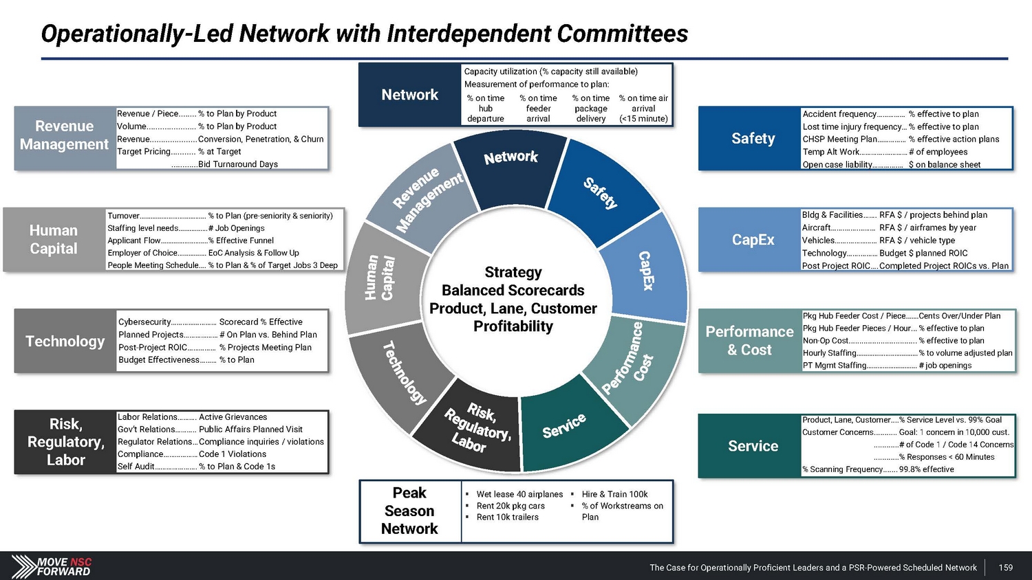 Operationally - Led Network with Interdependent Committees Technology Strategy Balanced Scorecards Product, Lane, Customer Profitability The Case for Operationally Proficient Leaders and a PSR - Powered Scheduled Network 159 ▪ Wet lease 40 airplanes ▪ ▪ Rent 20k pkg cars ▪ Rent 10k trailers Hire & Train 100k ▪ % of Workstreams on Plan Peak Season Network Safety Accident frequency…………… % effective to plan Lost time injury frequency… % effective to plan CHSP Meeting Plan…………… % effective action plans Temp Alt Work………….………… ❖ of employees Open case liability………….… $ on balance sheet CapEx Bldg & Facilities……. RFA $ / projects behind plan Aircraf t … …. … ….… … … RFA $ / airframes by year Veh i c le s…….… … … … … RFA $ / vehicle type T ech nolog y…….… … … Budget $ planned ROIC Post Project ROIC…. Completed Project ROICs vs. Plan Performanc e & Cost Pkg Hub Feeder Cost / Piece……. Cents Over/Under Plan Pkg Hub Feeder Pieces / Hour... % effective to plan Non - Op Cost................................ % effective to plan Hourly Staffing……………………………. % to volume adjusted plan PT Mgmt Staffing………………………. ❖ job openings Service Product, Lane, Customer.... % Service Level vs. 99% Goal Customer Concerns........... Goal: 1 concern in 10,000 cust. ............ ❖ of Code 1 / Code 14 Concerns ............ % Responses < 60 Minutes % Scanning Frequency....... 99.8% effective Network Capacity util Measuremen % on time hub departure ization (% capa t of performan % on time feeder arrival city still avai ce to plan : % on time package delivery lable) % on time air arrival (<15 minute) Revenue Ma n age m en t Revenue / Piece........ % to Plan by Product Volume...................... % to Plan by Product Revenue..................... Conversion, Penetration, & Churn Target Pricing........... % at Target ............ Bid Turnaround Days H u ma n Capita l T urno v er ………… … …… … …… … …. % to Plan (pre - seniority & seniority) Staffing level needs……………. ❖ Job Openings Applicant Flow…………………….. % Effective Funnel Employer of Choice……………. EoC Analysis & Follow Up People Meeting Schedule…. % to Plan & % of Target Jobs 3 Deep Cybersecurity…………………… Scorecard % Effective Planned Projects……………… ❖ On Plan vs. Behind Plan Post - Project ROIC…………… % Projects Meeting Plan Budget Effectiveness……… % to Plan Risk, Regula t o ry , Labor Labor Relations………. Active Grievances Gov’t Relations……….. Public Affairs Planned Visit Regulator Relations… Compliance inquiries / violations Compliance……………… Code 1 Violations Self Audit…………………. % to Plan & Code 1s