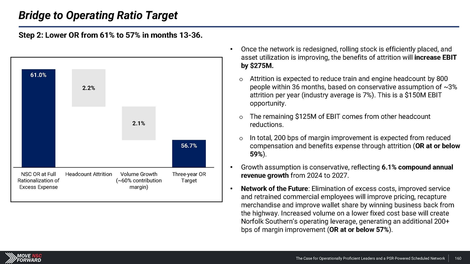 • Once the network is redesigned, rolling stock is efficiently placed, and asset utilization is improving, the benefits of attrition will increase EBIT by $275M. o Attrition is expected to reduce train and engine headcount by 800 people within 36 months, based on conservative assumption of ~3% attrition per year (industry average is 7%). This is a $150M EBIT opportunity. o The remaining $125M of EBIT comes from other headcount reductions. o In total, 200 bps of margin improvement is expected from reduced compensation and benefits expense through attrition ( OR at or below 59% ). • Growth assumption is conservative, reflecting 6.1% compound annual revenue growth from 2024 to 2027. • Network of the Future : Elimination of excess costs, improved service and retrained commercial employees will improve pricing, recapture merchandise and improve wallet share by winning business back from the highway. Increased volume on a lower fixed cost base will create Norfolk Southern’s operating leverage, generating an additional 200+ bps of margin improvement ( OR at or below 57% ). Step 2: Lower OR from 61% to 57% in months 13 - 36. Bridge to Operating Ratio Target 61.0% 56.7% 2.2% 2.1% NSC OR at Full Rationalization of Excess Expense Headcount Attrition Volume Growth (~60% contribution margin) Three - year OR Target The Case for Operationally Proficient Leaders and a PSR - Powered Scheduled Network 160