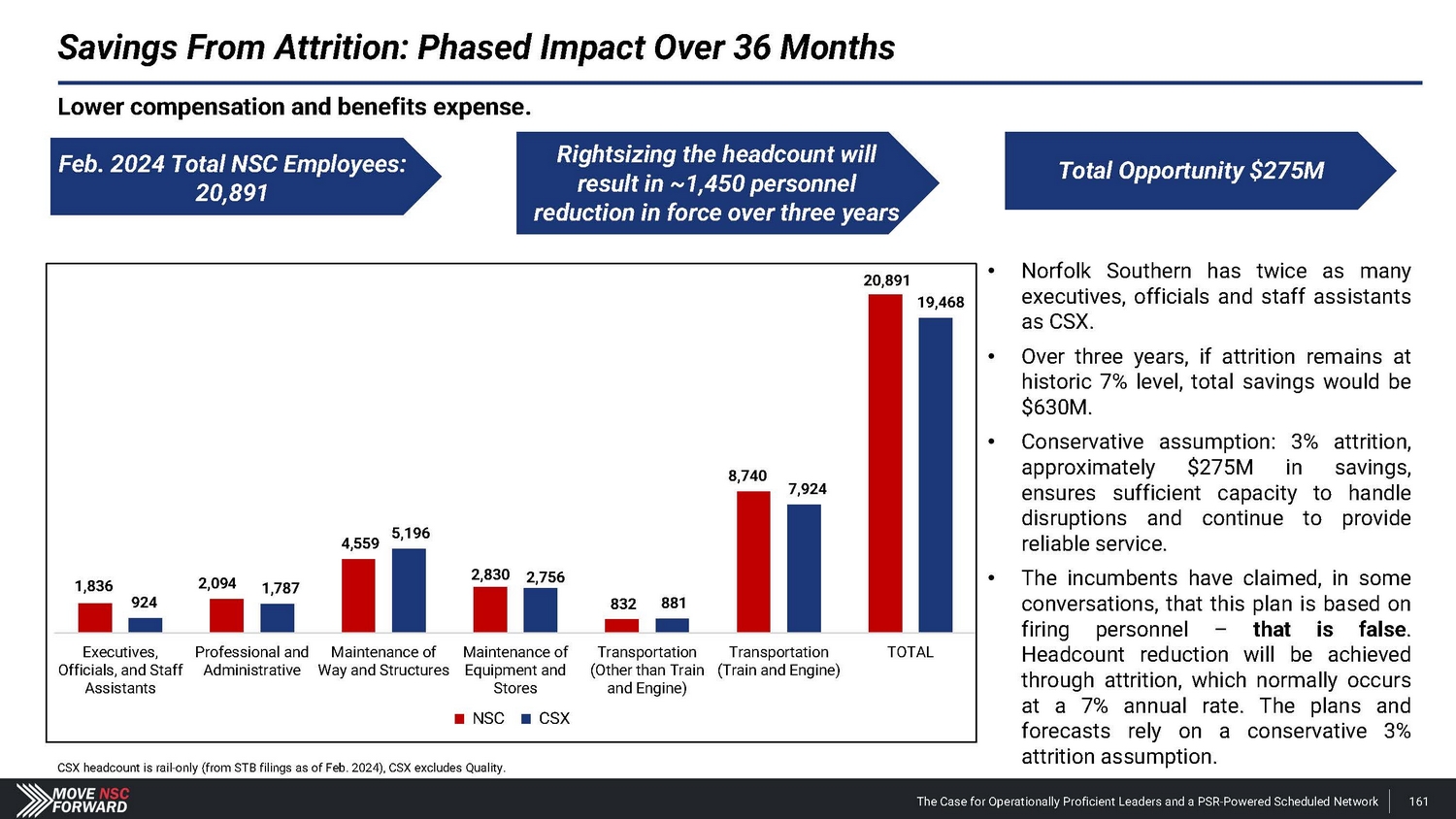 Lower compensation and benefits expense. Savings From Attrition: Phased Impact Over 36 Months CSX headcount is rail - only (from STB filings as of Feb. 2024), CSX excludes Quality. • Norfolk Southern has twice as many executives, officials and staff assistants as CSX . • Over three years, if attrition remains at historic 7% level, total savings would be $630M. • Conservative assumption: 3% attrition, appr o x i mately $ 27 5 M in savi n gs , ensures sufficient capacity to handle disruptions and continue to provide reliable service . • The incumbents have claimed, in some conversations, that this plan is based on firing personnel – that is false . Headcount reduction will be achieved through attrition, which normally occurs at a 7 % annual rate . The plans and forecasts rely on a conservative 3 % attrition assumption . 1,836 2,094 4,559 2,830 8,740 20,891 924 1,787 5,196 2,756 832 881 7,924 19,468 Assistants Executives, Professional and Maintenance of Maintenance of Officials, and Staff Administrative Way and Structures Equipment and Transportation Transportation (Other than Train (Train and Engine) and Engine) T OTAL Stores NS C CSX Feb. 2024 Total NSC Employees: 20,891 The Case for Operationally Proficient Leaders and a PSR - Powered Scheduled Network 161 Rightsizing the headcount will result in ~1,450 personnel reduction in force over three years Total Opportunity $275M