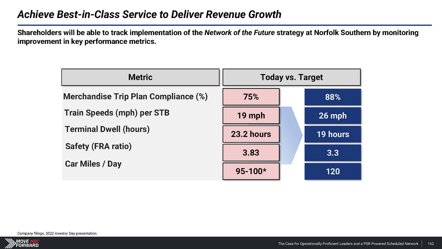 Shareholders will be able to track implementation of the Network of the Future strategy at Norfolk Southern by monitoring improvement in key performance metrics. Achieve Best - in - Class Service to Deliver Revenue Growth Today vs. Target Merchandise Trip Plan Compliance (%) Train Speeds (mph) per STB Terminal Dwell (hours) Safety (FRA ratio) Car Miles / Day Company filings, 2022 Investor Day presentation. 75% 1.9 mph 23.2 hours 3.83 95 - 100* Metric 75% 88% 19 mph 26 mph 23.2 hours 19 hours 3.83 3.3 95 - 100* 120 The Case for Operationally Proficient Leaders and a PSR - Powered Scheduled Network 162