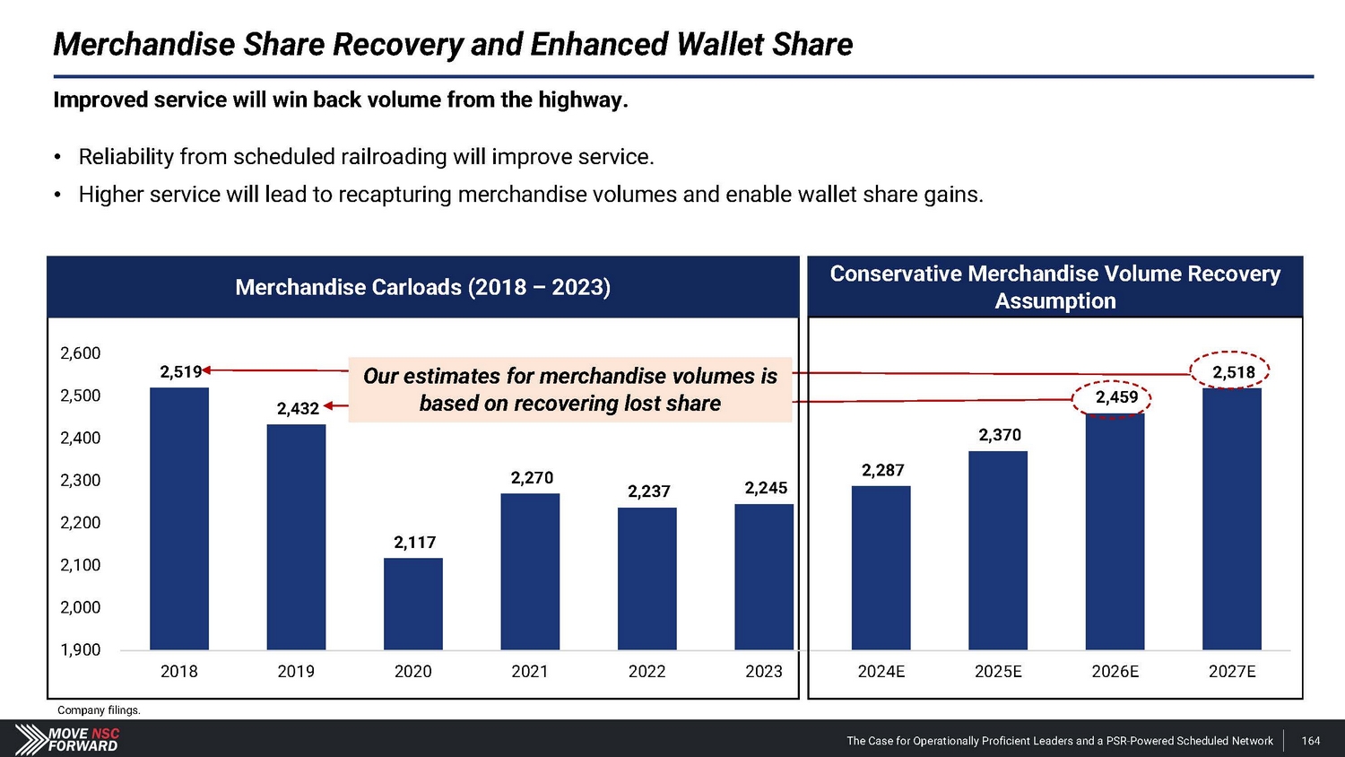 Merchandise Carload Categories 10% 5% 4.2% 1.5% (10.2)% C hemi c als NSC (23.0)% (32.9)% Petroleum Products CSX 8.6% 0.6% (8.1)% Minerals & Stone 0% - 5% (1.0)% (0.2)% - 1 0 % (6.8)% - 1 5 % (10.4)% (10.0)% (10.5)% - 2 0 % (16.6)% - 2 5 % (20.1)% - 3 0 % - 3 5 % Automotive Grain Paper & Lumber Metals Other Norfolk Southern’s inferior service can be quantified by comparing carload volumes with its closest comparable, CSX . Norfolk Southern has substantially underperformed CSX in every carload class and seven out of eight merchandise categories . If Norfolk Southern’s service was on par, its freight volume would have held even with CSX . Norfolk Southern Volume Underperformance Company filings, AAR Weekly Carloading Reports, Ancora estimates. Freight Volumes by Class – 2018 Carloads v. 2023 Carloads (% Change) Intermodal NSC - 12.6% 0% - 1 0 % - 20% - 3 0 % - 40% Coal Merchandise NSC - 11.9% CSX NSC CSX CSX 0% 0% - 5% - 10% - 4.1% - 16.4% - 5% - 10% - 2.8% - 15% - 33.0% - 15% The Case for Operationally Proficient Leaders and a PSR - Powered Scheduled Network 163