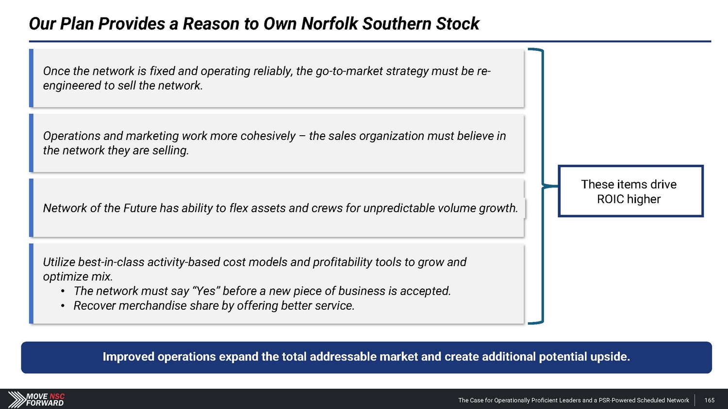 Our Plan Provides a Reason to Own Norfolk Southern Stock Improved operations expand the total addressable market and create additional potential upside. These items drive ROIC higher Once the network is fixed and operating reliably, the go - to - market strategy must be re - engineered to sell the network. Operations and marketing work more cohesively – the sales organization must believe in the network they are selling. Network of the Future has ability to flex assets and crews for unpredictable volume growth. Utilize best - in - class activity - based cost models and profitability tools to grow and optimize mix. • The network must say “Yes” before a new piece of business is accepted. • Recover merchandise share by offering better service. The Case for Operationally Proficient Leaders and a PSR - Powered Scheduled Network 165
