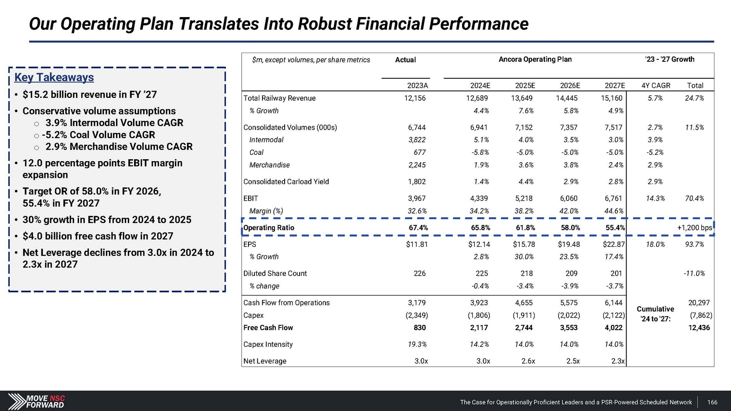 Our Operating Plan Translates Into Robust Financial Performance Key Takeaways • $15.2 billion revenue in FY ’27 • Conservative volume assumptions o 3.9% Intermodal Volume CAGR o - 5.2% Coal Volume CAGR o 2.9% Merchandise Volume CAGR • 12.0 percentage points EBIT margin expansion • Target OR of 58.0% in FY 2026, 55.4% in FY 2027 • 30% growth in EPS from 2024 to 2025 • $4.0 billion free cash flow in 2027 • Net Leverage declines from 3.0x in 2024 to 2.3x in 2027 $m, except volumes, per share metrics Actual 2023A Ancora Operating Plan '23 - '27 Growth 2024E 2025E 2026E 2027E 4Y CAGR Total Total Railway Revenue 12 , 15 6 12,689 13 , 64 9 14 , 44 5 15,160 5.7% 24.7% % Growth 4 . 4 % 7 . 6 % 5 . 8 % 4.9% Consolidated Volumes (000s) 6 , 74 4 6 , 94 1 7 , 15 2 7 , 35 7 7,517 2.7% 11.5% Intermodal 3 , 82 2 5 . 1 % 4 . 0 % 3 . 5 % 3.0% 3.9% Coal 677 - 5 . 8 % - 5 . 0 % - 5 . 0 % - 5.0% - 5.2% Merchandise 2 , 24 5 1 . 9 % 3 . 6 % 3 . 8 % 2.4% 2.9% Consolidated Carload Yield 1 , 80 2 1 . 4 % 4 . 4 % 2 . 9 % 2.8% 2.9% EBIT 3 , 96 7 4 , 33 9 5 , 21 8 6 , 06 0 6,761 14.3% 70.4% Margin (%) 32 . 6 % 34 . 2 % 38 . 2 % 42 . 0 % 44.6% Operating Ratio 67 . 4 % 65 . 8 % 61 . 8 % 58 . 0 % 55 . 4 % +1,200 bps EPS $11 . 8 1 $12 . 1 4 $15 . 7 8 $19 . 4 8 $22 . 8 7 18.0% 93.7% % Growth 2 . 8 % 30 . 0 % 23 . 5 % 17.4% Diluted Share Count 226 225 218 209 201 - 11.0% % change - 0 . 4 % - 3 . 4 % - 3 . 9 % - 3.7% Cash Flow from Operations Capex 3,179 (2,349) 3,923 (1,806) 4,655 (1,911) 5,575 (2,022) 6,144 (2,122) C u m u l a t i v e '24 to '27: 20,297 (7,862) Free Cash Flow 830 2 , 11 7 2 , 74 4 3 , 55 3 4,022 12,436 Capex Intensity 19 . 3 % 14 . 2 % 14 . 0 % 14 . 0 % 14.0% Net Leverage 3 . 0 x 3 . 0 x 2 . 6 x 2 . 5 x 2 . 3 x The Case for Operationally Proficient Leaders and a PSR - Powered Scheduled Network 166