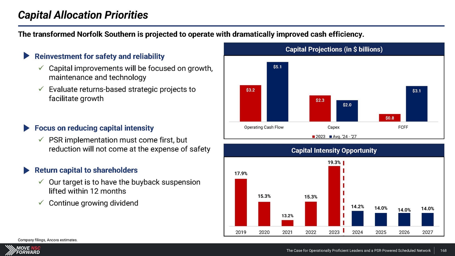 Capital Allocation Priorities Capital Intensity Opportunity 17.9% 15.3% 13.2% 15.3% 19.3% 14.2% 14.0% 14.0% 14.0% 2019 2 0 20 2021 2022 2 0 23 2024 2025 2026 2027 Capital Projections (in $ billions) $5.1 $3.2 $3.1 $2.3 $2.0 $0.8 Operating Cash Flow Capex FCFF 2023 Avg. '24 - '27 The transformed Norfolk Southern is projected to operate with dramatically improved cash efficiency. Reinvestment for safety and reliability x Capital improvements will be focused on growth, maintenance and technology x Evaluate returns - based strategic projects to facilitate growth Focus on reducing capital intensity x PSR implementation must come first, but reduction will not come at the expense of safety Return capital to shareholders x Our target is to have the buyback suspension lifted within 12 months x Continue growing dividend Company filings, Ancora estimates. The Case for Operationally Proficient Leaders and a PSR - Powered Scheduled Network 168