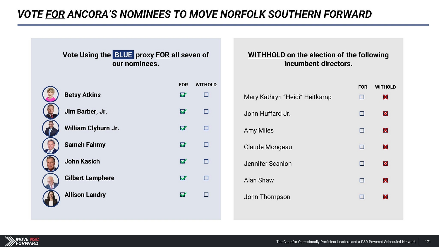 VOTE FOR ANCORA’S NOMINEES TO MOVE NORFOLK SOUTHERN FORWARD Vote Using the BLUE proxy FOR all seven of our nominees. FOR WIT H O LD Betsy Atkins Jim Barber, Jr. William Clyburn Jr. Sameh Fahmy John Kasich Gilbert Lamphere Allison Landry WITHHOLD on the election of the following incumbent directors. FOR WIT H O LD Mary Kathryn “Heidi” Heitkamp John Huffard Jr. Amy Miles Claude Mongeau Jennifer Scanlon Alan Shaw John Thompson The Case for Operationally Proficient Leaders and a PSR - Powered Scheduled Network 171