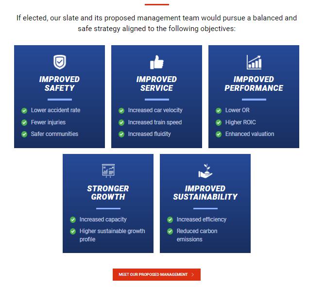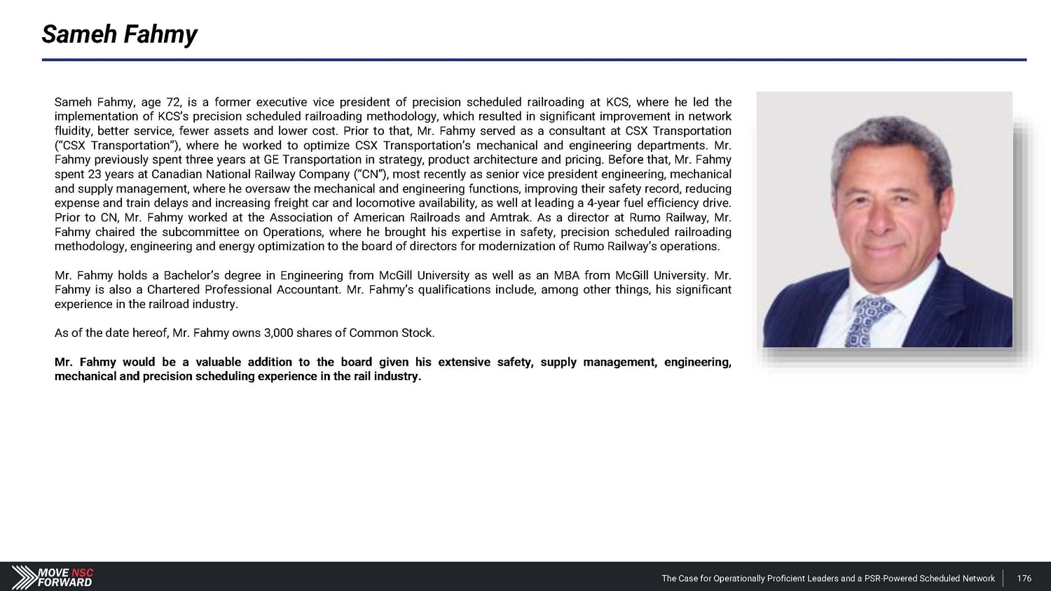 Sameh Fahmy Sameh Fahmy, age 72 , is a former executive vice president of precision scheduled railroading at KCS, where he led the implementation of KCS’s precision scheduled railroading methodology, which resulted in significant improvement in network fluidity, better service, fewer assets and lower cost . Prior to that, Mr . Fahmy served as a consultant at CSX Transportation (“CSX Transportation”), where he worked to optimize CSX Transportation’s mechanical and engineering departments . Mr . Fahmy previously spent three years at GE Transportation in strategy, product architecture and pricing . Before that, Mr . Fahmy spent 23 years at Canadian National Railway Company (“CN”), most recently as senior vice president engineering, mechanical and supply management, where he oversaw the mechanical and engineering functions, improving their safety record, reducing expense and train delays and increasing freight car and locomotive availability, as well at leading a 4 - year fuel efficiency drive . Prior to CN, Mr . Fahmy worked at the Association of American Railroads and Amtrak . As a director at Rumo Railway, Mr . Fahmy chaired the subcommittee on Operations, where he brought his expertise in safety, precision scheduled railroading methodology, engineering and energy optimization to the board of directors for modernization of Rumo Railway’s operations . Mr . Fahmy holds a Bachelor’s degree in Engineering from McGill University as well as an MBA from McGill University . Mr . Fahmy is also a Chartered Professional Accountant . Mr . Fahmy’s qualifications include, among other things, his significant experience in the railroad industry . As of the date hereof, Mr . Fahmy owns 3 , 000 shares of Common Stock . Mr . Fahmy would be a valuable addition to the board given his extensive safety, supply management, engineering, mechanical and precision scheduling experience in the rail industry . The Case for Operationally Proficient Leaders and a PSR - Powered Scheduled Network 176