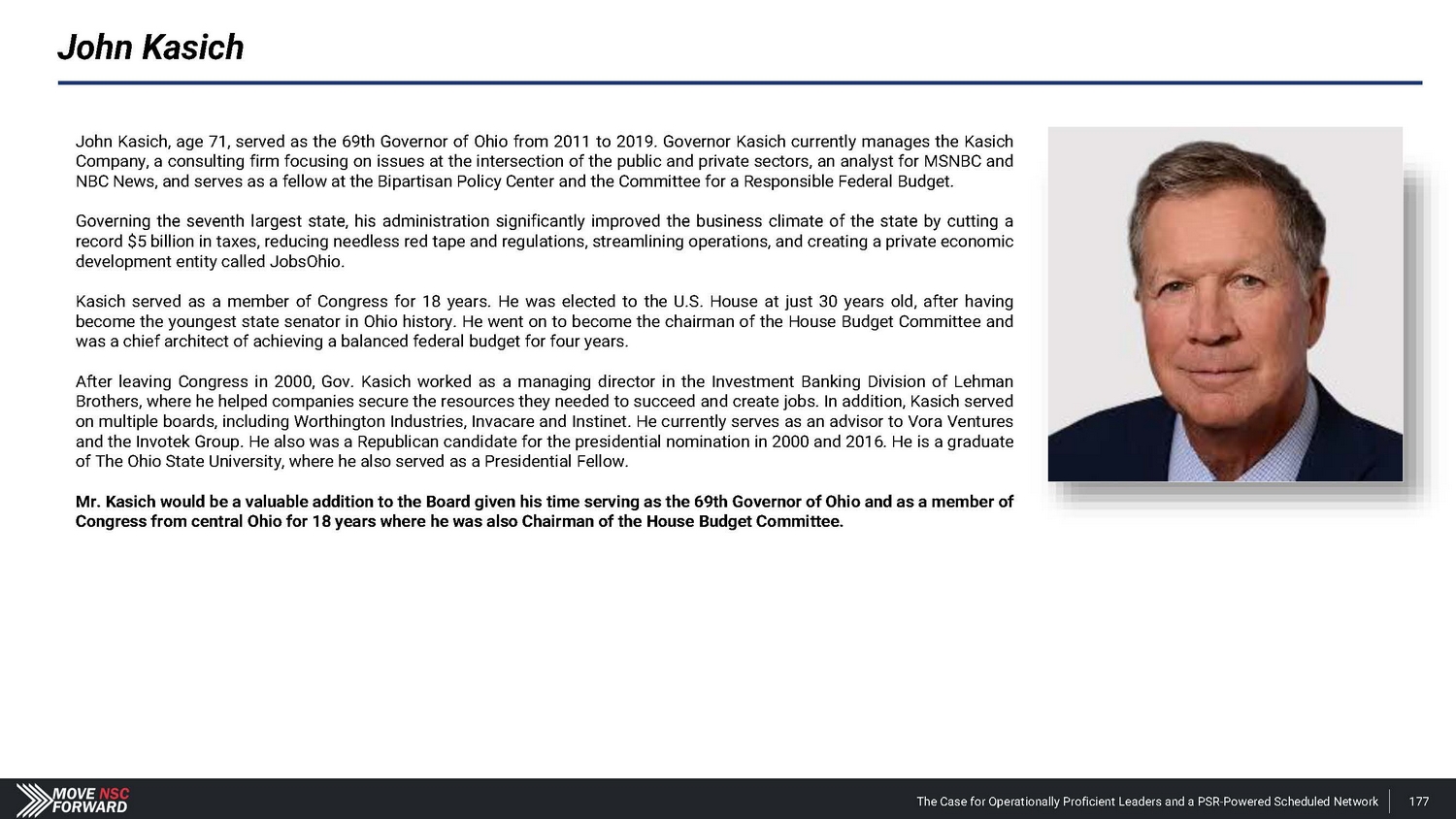 John Kasich John Kasich, age 71 , served as the 69 th Governor of Ohio from 2011 to 2019 . Governor Kasich currently manages the Kasich Company, a consulting firm focusing on issues at the intersection of the public and private sectors, an analyst for MSNBC and NBC News, and serves as a fellow at the Bipartisan Policy Center and the Committee for a Responsible Federal Budget . Governing the seventh largest state, his administration significantly improved the business climate of the state by cutting a record $ 5 billion in taxes, reducing needless red tape and regulations, streamlining operations, and creating a private economic development entity called JobsOhio . Kasich served as a member of Congress for 18 years . He was elected to the U . S . House at just 30 years old, after having become the youngest state senator in Ohio history . He went on to become the chairman of the House Budget Committee and was a chief architect of achieving a balanced federal budget for four years . After leaving Congress in 2000 , Gov . Kasich worked as a managing director in the Investment Banking Division of Lehman Brothers, where he helped companies secure the resources they needed to succeed and create jobs . In addition, Kasich served on multiple boards, including Worthington Industries, Invacare and Instinet . He currently serves as an advisor to Vora Ventures and the Invotek Group . He also was a Republican candidate for the presidential nomination in 2000 and 2016 . He is a graduate of The Ohio State University, where he also served as a Presidential Fellow . Mr . Kasich would be a valuable addition to the Board given his time serving as the 69 th Governor of Ohio and as a member of Congress from central Ohio for 18 years where he was also Chairman of the House Budget Committee . The Case for Operationally Proficient Leaders and a PSR - Powered Scheduled Network 177