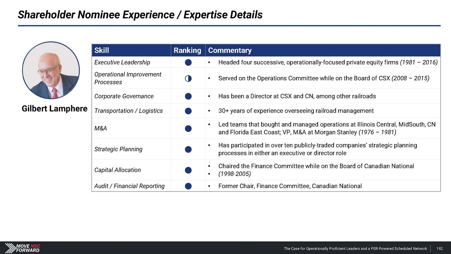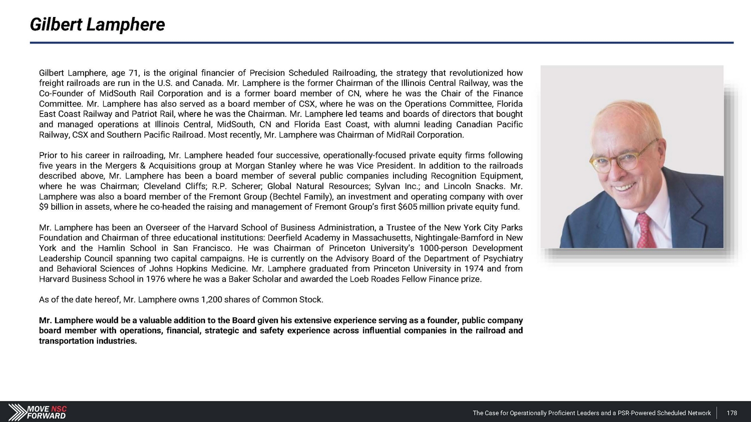 Gilbert Lamphere Gilbert Lamphere, age 71 , is the original financier of Precision Scheduled Railroading, the strategy that revolutionized how freight railroads are run in the U . S . and Canada . Mr . Lamphere is the former Chairman of the Illinois Central Railway, was the Co - Founder of MidSouth Rail Corporation and is a former board member of CN, where he was the Chair of the Finance Committee . Mr . Lamphere has also served as a board member of CSX, where he was on the Operations Committee, Florida East Coast Railway and Patriot Rail, where he was the Chairman . Mr . Lamphere led teams and boards of directors that bought and managed operations at Illinois Central, MidSouth, CN and Florida East Coast, with alumni leading Canadian Pacific Railway, CSX and Southern Pacific Railroad . Most recently, Mr . Lamphere was Chairman of MidRail Corporation . Prior to his career in railroading, Mr . Lamphere headed four successive, operationally - focused private equity firms following five years in the Mergers & Acquisitions group at Morgan Stanley where he was Vice President . In addition to the railroads described above, Mr . Lamphere has been a board member of several public companies including Recognition Equipment, where he was Chairman ; Cleveland Cliffs ; R . P . Scherer ; Global Natural Resources ; Sylvan Inc .; and Lincoln Snacks . Mr . Lamphere was also a board member of the Fremont Group (Bechtel Family), an investment and operating company with over $ 9 billion in assets, where he co - headed the raising and management of Fremont Group’s first $ 605 million private equity fund . Mr . Lamphere has been an Overseer of the Harvard School of Business Administration, a Trustee of the New York City Parks Foundation and Chairman of three educational institutions : Deerfield Academy in Massachusetts, Nightingale - Bamford in New York and the Hamlin School in San Francisco . He was Chairman of Princeton University’s 1000 - person Development Leadership Council spanning two capital campaigns . He is currently on the Advisory Board of the Department of Psychiatry and Behavioral Sciences of Johns Hopkins Medicine . Mr . Lamphere graduated from Princeton University in 1974 and from Harvard Business School in 1976 where he was a Baker Scholar and awarded the Loeb Roades Fellow Finance prize . As of the date hereof, Mr . Lamphere owns 1 , 200 shares of Common Stock . Mr . Lamphere would be a valuable addition to the Board given his extensive experience serving as a founder, public company board member with operations, financial, strategic and safety experience across influential companies in the railroad and transportation industries . The Case for Operationally Proficient Leaders and a PSR - Powered Scheduled Network 178