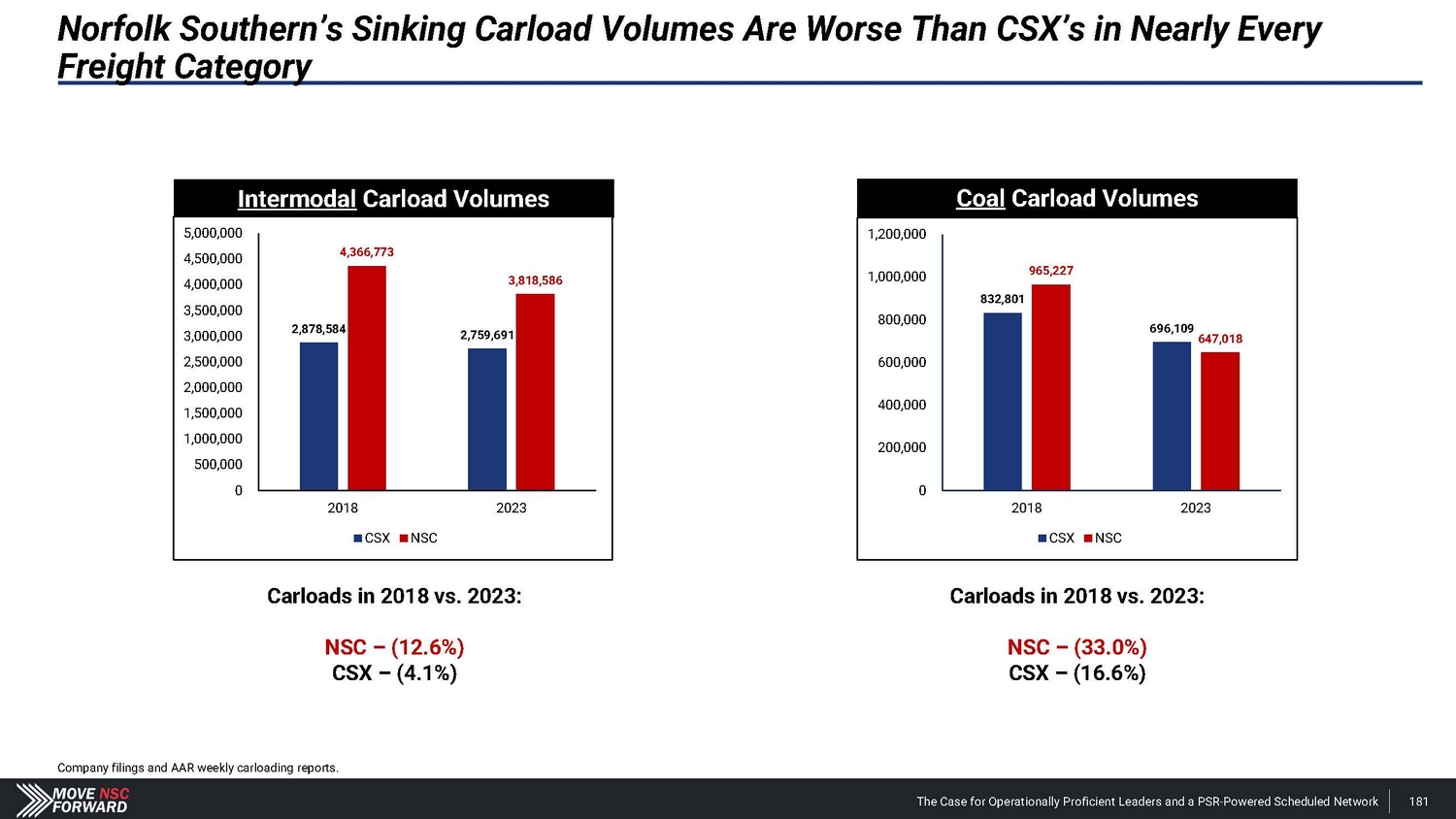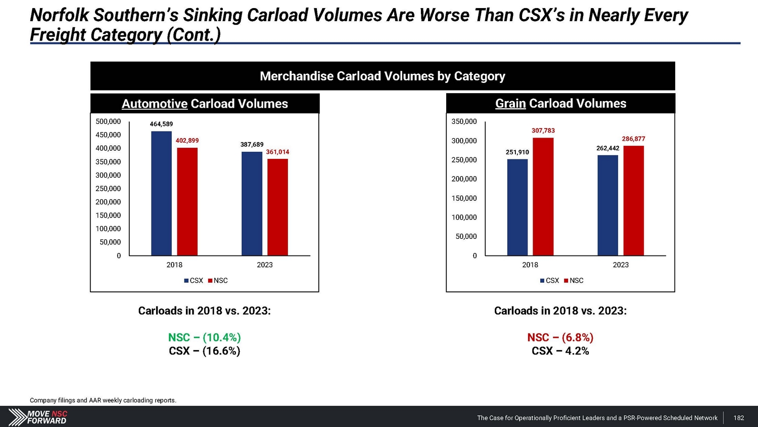 Norfolk Southern’s Sinking Carload Volumes Are Worse Than CSX’s in Nearly Every Freight Category Coal Carload Volumes 1 ,200 , 0 0 0 1,000 , 000 9 6 5, 2 27 832,801 800,0 0 0 696,109 647,018 600,0 0 0 400,0 0 0 200,0 0 0 0 2018 2023 CSX NSC Carloads in 2018 vs. 2023: NSC – (33.0%) CSX – (16.6%) Intermodal Carload Volumes 5,000 , 000 4,500 , 000 4, 3 6 6,77 3 4,000 , 000 3,818,586 3,500 , 000 3,000 , 000 2,878,584 2,759,691 2,500 , 000 2,000 , 000 1,500 , 000 1,000 , 000 500,0 0 0 0 2018 2023 CSX NSC Company filings and AAR weekly carloading reports. The Case for Operationally Proficient Leaders and a PSR - Powered Scheduled Network 181 Carloads in 2018 vs. 2023: NSC – (12.6%) CSX – (4.1%)