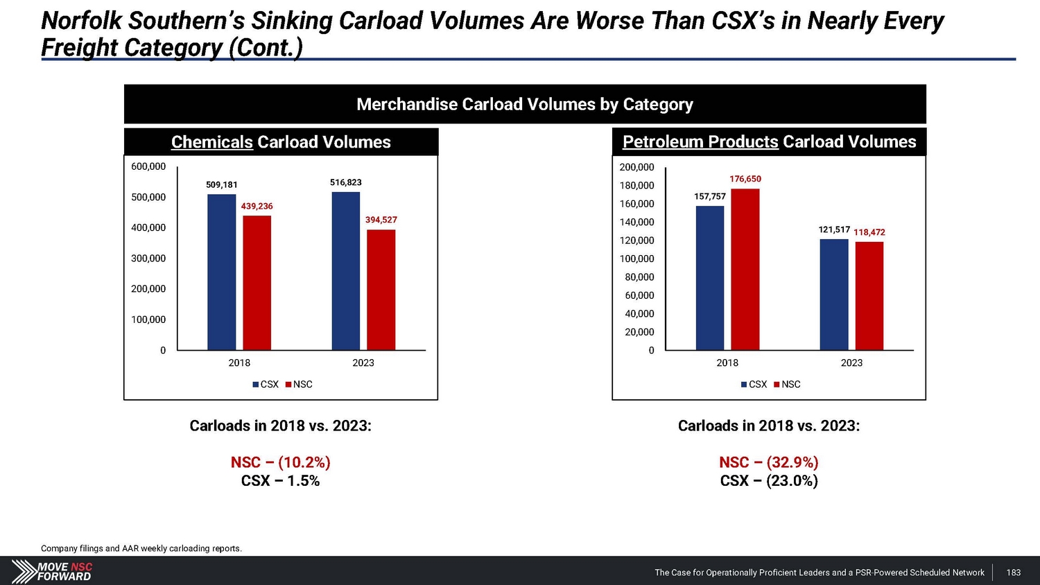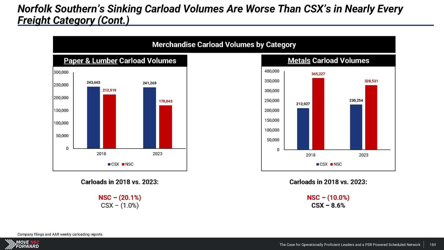 Norfolk Southern’s Sinking Carload Volumes Are Worse Than CSX’s in Nearly Every Freight Category (Cont.) Carloads in 2018 vs. 2023: NSC – (10.2%) CSX – 1.5% Carloads in 2018 vs. 2023: NSC – (32.9%) CSX – (23.0%) Merchandise Carload Volumes by Category Chemicals Carload Volumes Petroleum Products Carload Volumes 600,0 0 0 2 0 0 ,0 0 0 509,181 516,823 180,0 0 0 1 7 6, 6 50 500,0 0 0 4 3 9, 2 36 160,0 0 0 157,757 400,0 0 0 394,527 140,000 120,000 121,517 118,472 300,0 0 0 100,0 0 0 80,000 200,0 0 0 60,000 100,0 0 0 40,000 2 0 , 0 0 0 0 0 2018 2023 2018 2023 CSX NSC CSX NSC Company filings and AAR weekly carloading reports. The Case for Operationally Proficient Leaders and a PSR - Powered Scheduled Network 183