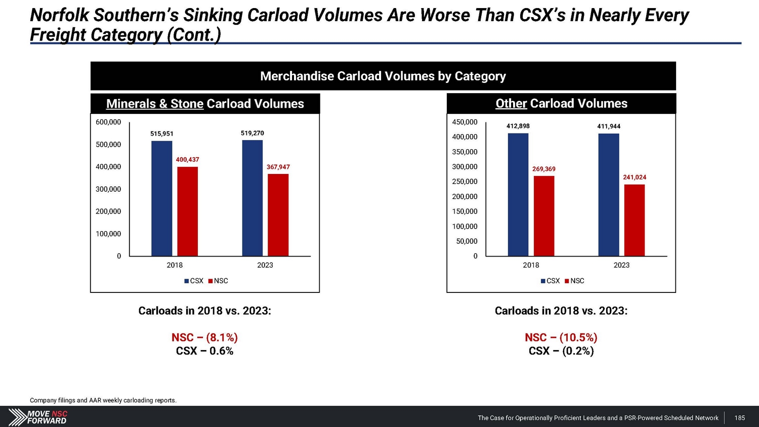 Norfolk Southern’s Sinking Carload Volumes Are Worse Than CSX’s in Nearly Every Freight Category (Cont.) Carloads in 2018 vs. 2023: NSC – (20.1%) CSX – (1.0%) Carloads in 2018 vs. 2023: NSC – (10.0%) CSX – 8.6% Merchandise Carload Volumes by Category Paper & Lumber Carload Volumes Metals Carload Volumes 300,0 0 0 400,0 0 0 365,2 2 7 250,0 0 0 243,663 241,269 350,0 0 0 328,531 2 1 2, 9 19 300,0 0 0 200,0 0 0 170,043 250,0 0 0 212,027 230,254 150,0 0 0 200,0 0 0 100,0 0 0 1 5 0 ,0 0 0 100,0 0 0 50,000 50,000 0 2018 2023 0 2018 2023 CSX NSC CSX NSC Company filings and AAR weekly carloading reports. The Case for Operationally Proficient Leaders and a PSR - Powered Scheduled Network 184