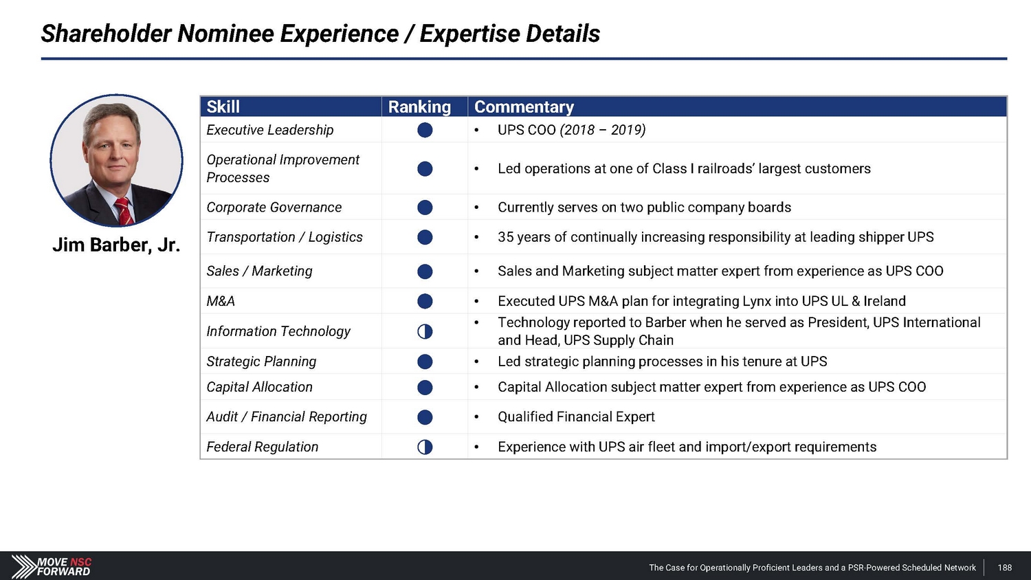 Jim Barber, Jr. James Barber, Jr . , age 63 , currently serves on the Board of Directors of C . H . Robinson Worldwide, Inc . , where he is a member of the Audit Committee . In addition, he serves on the Board of Directors of U . S . Foods Holding Corp . , where he is a member of the Compensation and Human Capital Committee . His professional experience includes many roles at UPS over the course of a 35 - year career that began as a delivery driver . Most recently, Mr . Barber served at senior leadership positions at UPS, starting in 2013 as President of Europe, Middle East and Africa, holding that position until he moved in 2015 to the President of UPS International and then later taking over in 2018 as the Chief Operating Officer of UPS, which position he held until 2020 . Mr . Barber holds a Bachelor of Science in Finance from Auburn University . Mr . Barber’s qualifications include, among other things, his significant experience in finance, strategic planning, corporate transactions and risk management from decades of work in shipping and logistics at UPS . This experience encompassed leadership positions in UPS’s Domestic and International business units as well as in Supply Chain Solutions, including both Global Freight Forwarding and Coyote Logistics, and provided valuable insights into key topics relevant to the Company’s business . Mr . Barber also has demonstrated experience in the areas of finance and accounting as well as growth strategies and operations . Mr . Barber meets the definition of an “Audit Committee Financial Expert” as established by the SEC . He was also a former Trustee at the UPS Foundation, a board member of UNICEF and formerly served on the board of the Folks Center for International Business at the University of South Carolina . Mr . Barber would be a valuable addition to the Board given his extensive executive leadership, corporate governance and strategy, audit and finance experience in the shipping, logistics and supply chain industries . The Case for Operationally Proficient Leaders and a PSR - Powered Scheduled Network 174