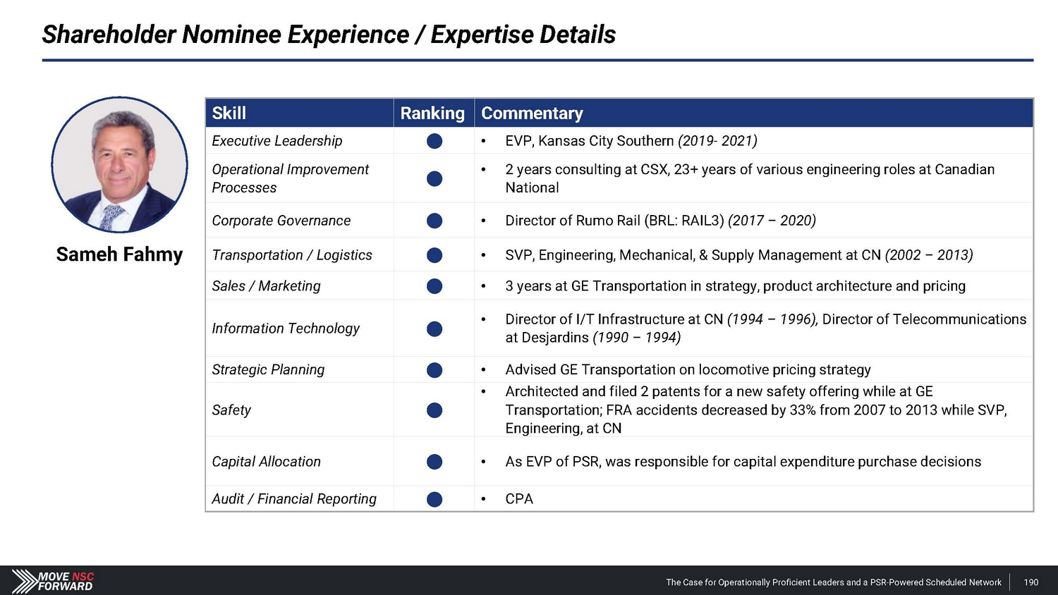 Sameh Fahmy Shareholder Nominee Experience / Expertise Details Skill Ranking Commentary Executive Leadership ᶇ • EVP, Kansas City Southern (2019 - 2021) Operational Improvement Processes ᶇ • 2 years consulting at CSX, 23+ years of various engineering roles at Canadian National Corporate Governance ᶇ • Director of Rumo Rail (BRL: RAIL3) (2017 – 2020) Transportation / Logistics ᶇ • SVP, Engineering, Mechanical, & Supply Management at CN (2002 – 2013) Sales / Marketing ᶇ • 3 years at GE Transportation in strategy, product architecture and pricing Information Technology ᶇ • Director of I/T Infrastructure at CN (1994 – 1996), Director of Telecommunications at Desjardins (1990 – 1994) Strategic Planning ᶇ • Advised GE Transportation on locomotive pricing strategy Safety ᶇ • Architected and filed 2 patents for a new safety offering while at GE Transportation; FRA accidents decreased by 33% from 2007 to 2013 while SVP, Engineering, at CN Capital Allocation ᶇ • As EVP of PSR, was responsible for capital expenditure purchase decisions Audit / Financial Reporting ᶇ • CPA The Case for Operationally Proficient Leaders and a PSR - Powered Scheduled Network 190